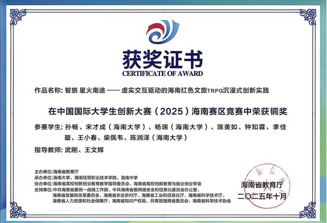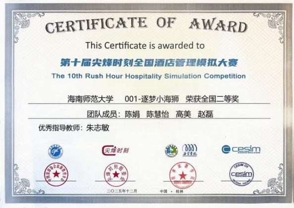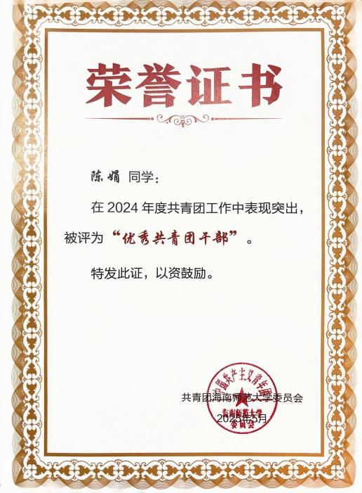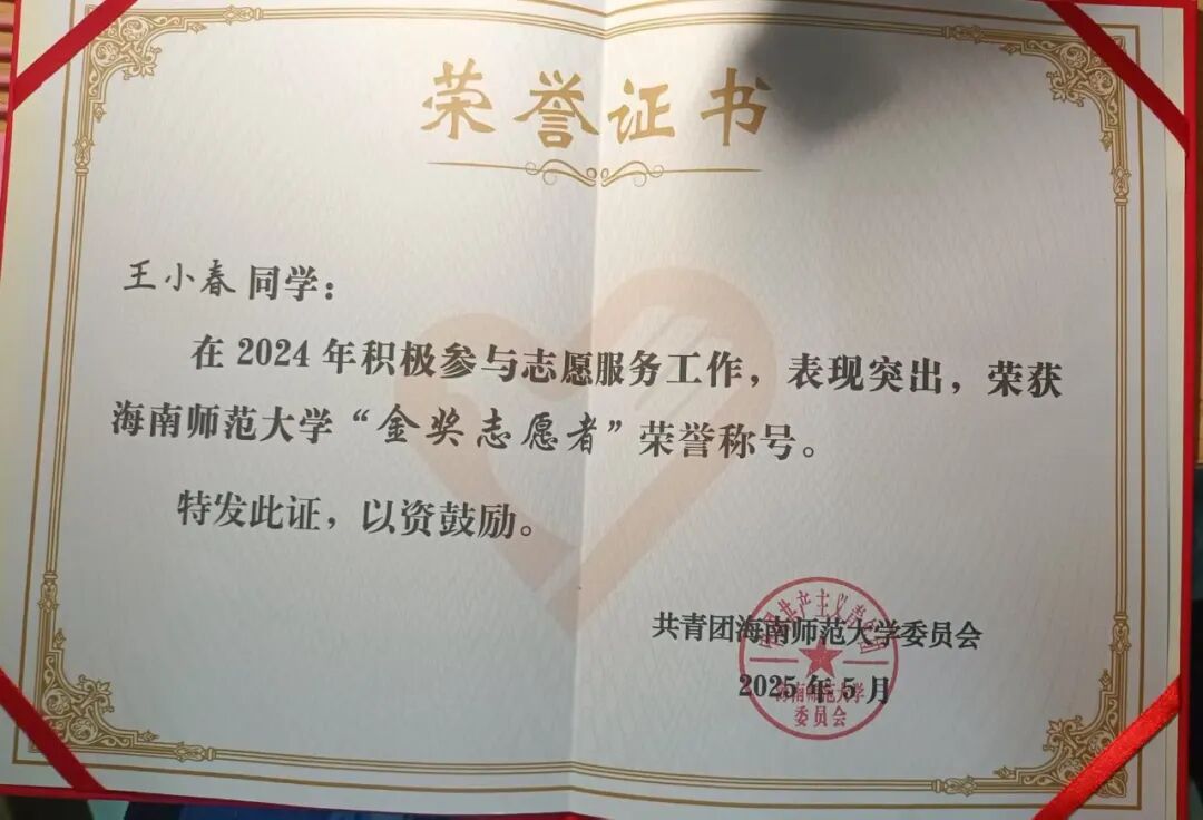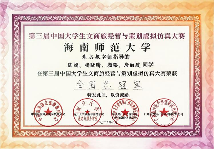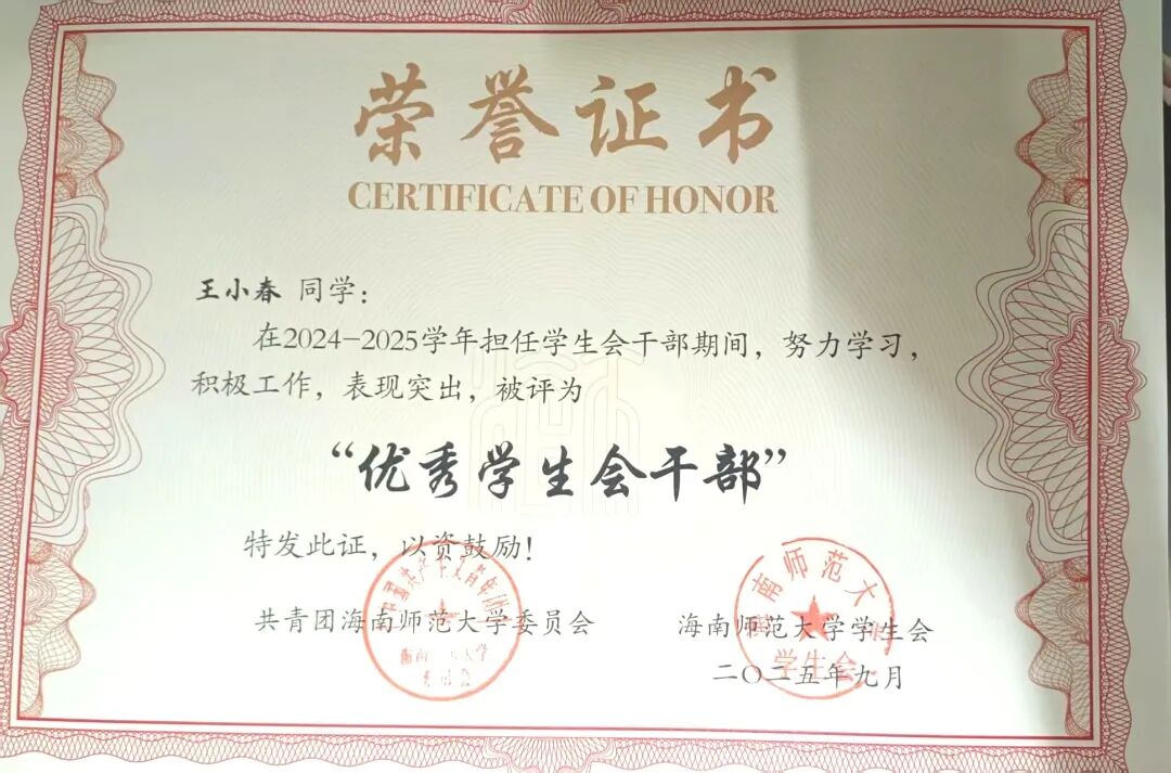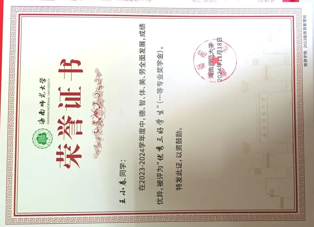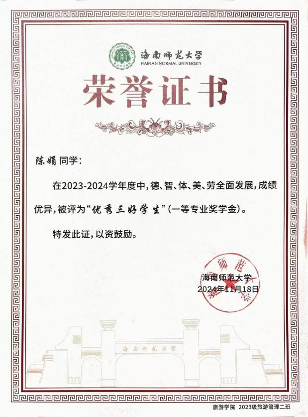 一.王小春 王小春同学: 女,汉族,中共党员,海南师范大学旅游学院旅游管理专业2022级本科生。现任班级团支书,曾任院学生会主席、院学工办助理、院文艺体育部负责人、校党委组织部学生助理,连续两年综合测评专业第一,累计志愿时长683小时。 获奖经历: 连续两年获得国家励志奖学金 连续两年获得校级一等奖学金 中国国际大学生创新大赛海南省铜奖 中国国际大学生创新大赛校级银奖 校级“金奖志愿者” 校级“优秀共青团员” 校级“优秀共青团干部” 王小春始终坚信,学生的第一要务是学习,唯有筑牢知识根基,才能积蓄力量,扬帆远航。因此,她将学业放在首位,以严谨的态度对待每一门课程。课堂上,她专注听讲,积极思考;课后,图书馆和自习室成为她沉淀知识的港湾。为了攻克难点,她制定了系统的学习计划,查阅文献,观看线上课程,直至彻底理解。这份坚持,让她连续三年专业成绩名列前茅,连续两年综合测评专业第一,并荣获了国家励志奖学金和校级一等奖学金等荣誉。她深知,知识的疆域辽阔无垠。在专业学习之余,她主动拓展视野,阅读管理学、社会学等书籍,积极参与各类学术讲座,与不同专业的同学交流心得。她还考取了导游资格证、教师资格证、计算机二级证书,为自身的综合发展打下了坚实基础。 作为一名中共党员,她始终牢记“为人民服务”的根本宗旨。从班级团支书到院学生会主席,从院学工办助理到校党委组织部学生助理,她在多个服务岗位上恪尽职守、全力以赴,以实际行动践行初心使命。担任院学生会主席期间,她立足学生需求,开展问卷调研,牵头举办“2024旅游学院青春逐梦·礼颂华诞迎新晚会”、歌手大赛等特色活动,用心搭建学院与学生之间的沟通桥梁。担任班级团支书时,她积极组织团建与团日活动,带领同学们深入学习团的知识,不断增强班级凝聚力。在学生助理岗位上,她严谨细致地处理各类文件、协调各项事务,在实践中锤炼了扎实的组织协调能力与责任担当。 ▲2023-2024学年“优秀三好学生”(一等专业奖学金) ▲2023-2024学年国家励志奖学金 “志愿是一束光,既能照亮他人,也能温暖自己。”这是王小春投身志愿服务后最真切的感受。入学以来,她从暑期“三下乡”到博鳌亚洲论坛,从校园服务到社区公益,在需要的地方默默贡献力量,她的累计服务时长达到683小时。 2025年,她有幸成为博鳌亚洲论坛年会志愿者。面对高强度的工作,她和伙伴们始终保持专业与热情,用微笑服务每一位嘉宾,这段经历让她深感自豪,也见证了国家主场外交的荣光。在“三下乡”社会实践中,她作为宣传组负责人,协助团队深入海南热带雨林地区开展实地调研,通过数据收集与群众访谈,系统分析区域生态保护现状与公众认知水平;在过程中,她负责撰写多篇科普宣传材料,通过线上线下多渠道传播,有效提升了项目影响力与社区参与度。此外,校园迎新、图书整理、文明交通等常规志愿服务中也常有她的身影。她坚信,志愿并非一时热血,更贵在恒久的坚持。 ▲金奖志愿者 ▲2024-2025学年“优秀学生会干部” 在实践中,王小春将知识转化为创新能力与解决实际问题的本领,既“读万卷书”,也“行万里路”。为此,她积极投身各类创新创业竞赛,在实践中锤炼自我。2025年中国国际大学生创新大赛中,她与团队成员并肩作战,深入开展市场调研,反复打磨项目方案,最终荣获省级奖项1项、校级奖项3项,院级荣誉7项。在学院咖啡厅团队PK赛、教师技能大赛、酒店知识技能大赛等活动中,她也积极参与、奋勇争先,斩获多项荣誉。这些竞赛经历既是挑战,更是成长,有效锻炼了她的创新思维、团队协作能力与抗压能力。 每一份成绩都是新征程的起点,每一份荣誉都承载着更重的责任。作为一名青年党员,她始终不忘初心,以更高标准严格要求自己,在学业上精益求精,在工作中恪尽职守,在奉献中传递温暖,在创新中勇于突破。“路漫漫其修远兮,吾将上下而求索。”前路漫漫,她将继续以青春之名赴时代之约,用奋斗书写无愧于祖国、无愧于人民的青春华章。 ▲中国国际大学生创新大赛(2025)省级铜奖 二.陈娟 陈娟同学: 女,汉族,中共预备党员,海南师范大学旅游学院旅游管理专业2023级本科生,现任2023级旅游管理2班班团、旅游学院团委副书记。前五学期平均学分绩点4.16,专业第一。 获奖经历: 校级“优秀三好学生” 校级“优秀共青团干部” 校级“金奖志愿者” 第三届中国大学生文商旅经营与策划虚拟仿真大赛全国总冠军 第十届尖烽时刻全国大学生酒店管理模拟经营大赛全国二等奖 2024年全国大学生英语翻译大赛(NETCCS)全国三等奖 第十五届电子商务三创赛校级一等奖/最佳创意奖 两次获得中国国际大学生创新创业大赛(2025)校级铜奖 2025年大学生暑期文化科技卫生“三下乡”社会实践活动校级优秀学生、优秀调查报告(论文)二等奖、优秀团队(负责人) 自踏入校园的那一刻起,陈娟便将学习视为自己的首要任务。在学业上,她前五学期课程平均学分绩点4.16,专业核心与专业必修课程平均学分绩点4.25,连续两年专业成绩与综合成绩排名蝉联专业第一;在计算机领域,完成Python程序设计课程后,她主动考取了计算机二级证书(Python和WPS Office);在财经方向,系统学习会计学与财务管理课程后,她顺利考取了初级会计职业技术资格证;在规划领域,通过旅游规划与开发