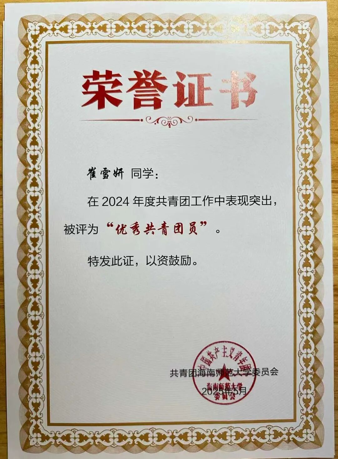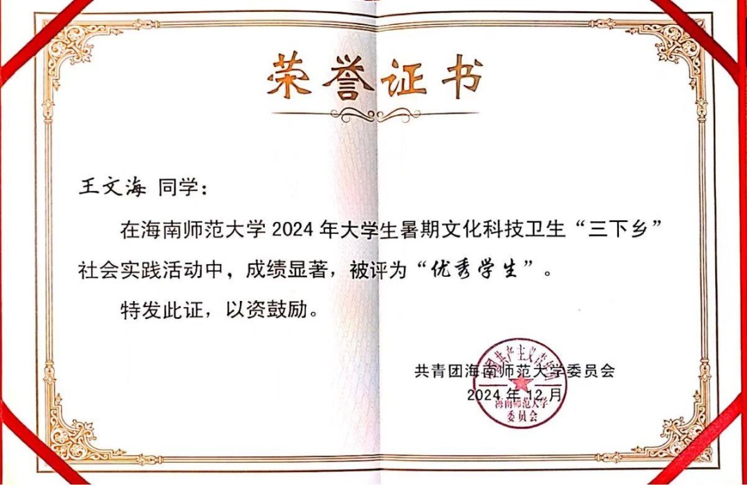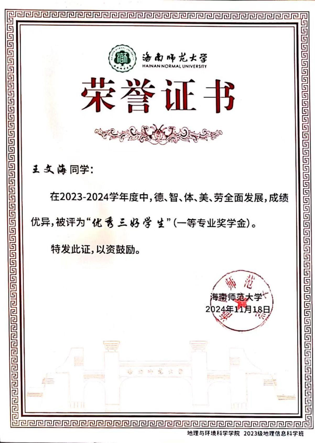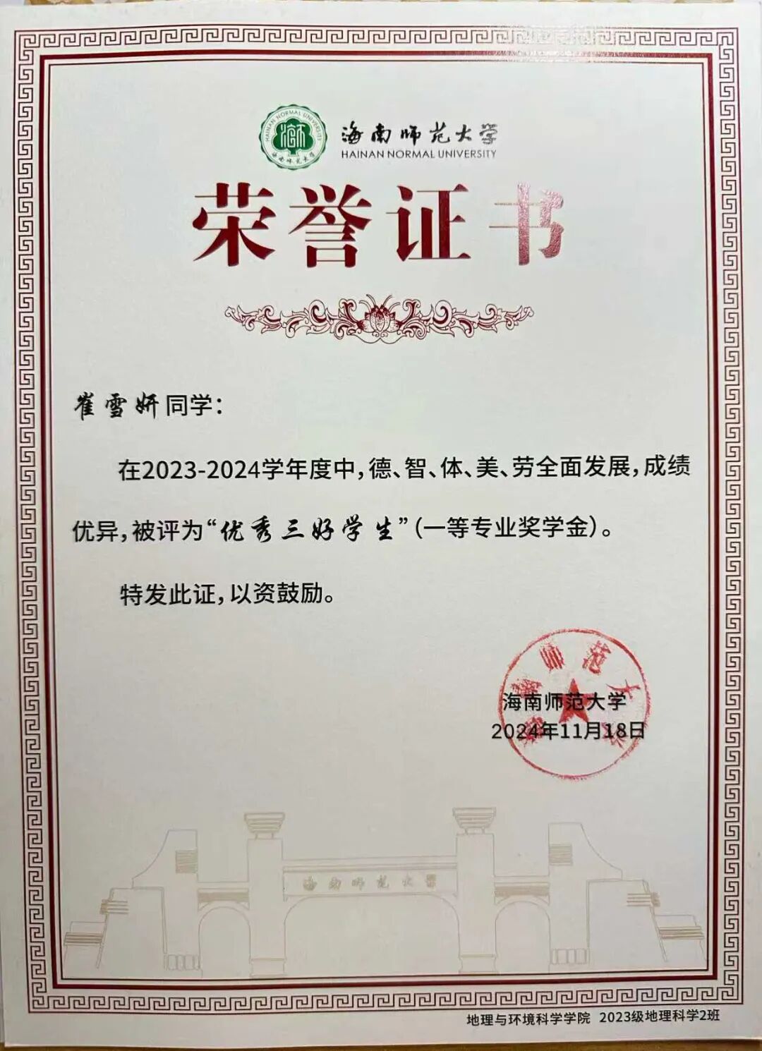 一.王文海 王文海同学: 女,地理与环境科学学院地理信息科学专业2023级学生,专业绩点4.01,排名第一。 获奖经历: 国家励志奖学金 两次获得校级优秀三好学生 两次获得中国国际大学生创新大赛校级银奖 “三下乡”社会实践“优秀学生” 中科院天山冰川所科研实习中 获“最佳汇报一等奖” 校级“银奖志愿者” 高中时期,王文海的书桌上总是堆满各式地图。在等高线的脉络和气候图的色块中,这份对于地理的纯粹热爱,成为她求学路上的不竭动力。进入大学后,她始终保持着对知识的敬畏与渴求。大学两年间,她以4.01的绩点位列专业第一,先后荣获国家励志奖学金、校级优秀三好学生等荣誉。那个曾经在地图前浮想联翩的孩子,如今已学会用专业知识和先进技术,真正去解读、去丈量、去守护我们赖以生存的山水与海洋。 她深知优秀的地理人既要“读万卷书”,更要“行万里路”。大一时,她便牵头组建团队参加中国国际大学生创新大赛。在项目中,她负责核心技术攻关,带领团队攻克了多个技术难题,连续两年荣获校级银奖和校级大创立项;随着专业学习的深入,自2024年9月起,她跟随导师参与国家自然基金项目的研究,投身海岸线演变研究。在过程中自学机器解译的原理方法,掌握了遥感数据处理的核心技术;在科研的道路上,她积极参与学术交流,钻研GIS技术与机器学习方法。这些宝贵的实践经历,让她深刻认识到:科研不仅要追求理论创新,更要服务社会需求。 荣誉是对过往耕耘的肯定,更是前行的底气。她始终以地理人的使命与担当,在丈量山河、探索海洋、守护生态的道路上步履不停,用专业与热爱书写属于青年学子的奋进篇章。 ▲中国国际大学生创新大赛海南师范大学校级赛青年红色筑梦之旅银奖 ▲2023-2024年度“优秀三好学生”(一等专业奖学金) 2025年暑假,王文海迎来科研道路上的重要突破——赴新疆参与中科院西北生态环境研究所天山冰川科研启航计划,在实践中完成对专业能力与科研素养的双重锤炼。 在冰川遥感组,她与团队利用高分辨率遥感影像为冰川编目建档,为每一处冰川精准“上户口”。攀登海拔四千米的乌鲁木齐河源1号冰川时,高原反应与凛冽寒风未能阻挡她的脚步,亲眼见证冰川消融痕迹,让她真切领悟到地理科研的使命与重量。在项目汇报中,她反复打磨内容架构与展示细节,从逻辑框架到图表呈现均精益求精。最终,她代表团队所作的学术汇报凭借研究扎实、表达清晰、逻辑严谨,在众多作品中脱颖而出,斩获“最佳汇报一等奖”。 此次新疆之行,让她成功实现从山川到海洋的科研贯通。在探究冰川变化与海平面关联机制的过程中,她逐步建立起地球系统科学整体观,以跨尺度、跨领域的研究视野,在地理科研之路上稳步前行。 ▲2023-2024年度国家励志奖学金 作为一名优秀的地理学子,大一期间,王文海积极参与“三下乡”社会实践,运用地理信息技术与专业模型评估农村养老需求,研究成果为地方政策制定提供重要参考,以实干彰显专业价值,以优异的表现荣获了社会实践“优秀学生”称号。 两年来,她积极参与志愿服务,累计服务248小时,获得银奖志愿者称号。从社区服务到科普宣传,从校园公益到社会援助,她在不同的志愿服务中践行着地理人的社会责任。回望大学时光,对地理的赤诚热爱、对未知的不懈探索、将个人理想融入国家发展的使命担当,始终是她前行的动力。从课堂钻研到科研实践,从山川考察到海洋探索,每份荣誉都是她脚踏实地、奋力拼搏的最好见证。 如今,她坚持研读中英文前沿文献,不断完善跨学科知识体系。从昔日在地图前憧憬海洋的学子,成长为立志投身海洋地质研究的青年科研后备力量。未来,她将继续以地理信息技术为依托,以山河海洋为舞台,在认识海洋、保护海洋、经略海洋的征程中坚定前行,绘制出属于青年一代的时代担当。 ▲2024暑期“三下乡”社会实践“优秀学生” ▲20223-2024“优秀三好学生”(一等专业奖学金) 二.崔雪妍 崔雪妍同学: 女,地理与环境科学学院地理科学专业2023级学生,中共预备党员,专业绩点4.17,排名第一。 获奖经历: 中国国际大学生创新大赛校级铜奖3项、优秀奖2项 连续两年获评校级“优秀三好学生” 连续两年获评校级“优秀共青团员” 2025“外研社·国才杯”“理解当代中国”全国大学生外语能力大赛校赛笔译赛项金奖 2025“外研社·国才杯”“理解当代中国”全国大学生外语能力大赛校赛综合能力赛项银奖 2025年大学生暑期文化科技卫生“三下乡”社会实践活动优秀调查报告(论文)校级二等奖 2024年“挑战杯”海南师范大学大学生创业计划竞赛优秀奖 校级“银奖志愿者” “心有所信,方能行远。”自递交入党申请书以来,崔雪妍始终将坚定理想信念作为立身之本。2023年9月,她郑重向党组织递交入党申请书;2025年12月,光荣成为一名预备党员。在理论学习的道路上,她主动学习党的创新理论,不断提升政治判断力、政治领悟力、政治执行力,并连续两年在团员教育评议中获评“优秀”等级。作为班级副团支书,她积极协助团支书开展主题团日与班级活动,主动关心同学思想动态,耐心沟通引导,助力同学们树立正确的世界观、人生观、价值观。她始终坚持将个人理想融入国家发展与民族复兴伟业,以实际行动践行青年使命。 在学业上,她始终秉持“勤能补拙,精