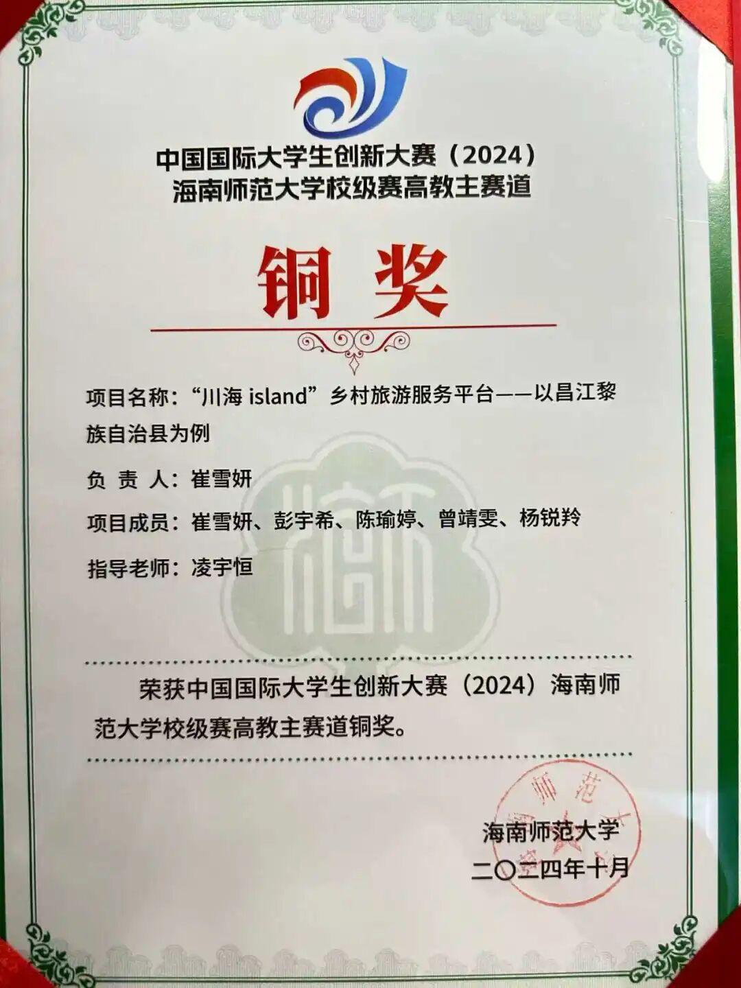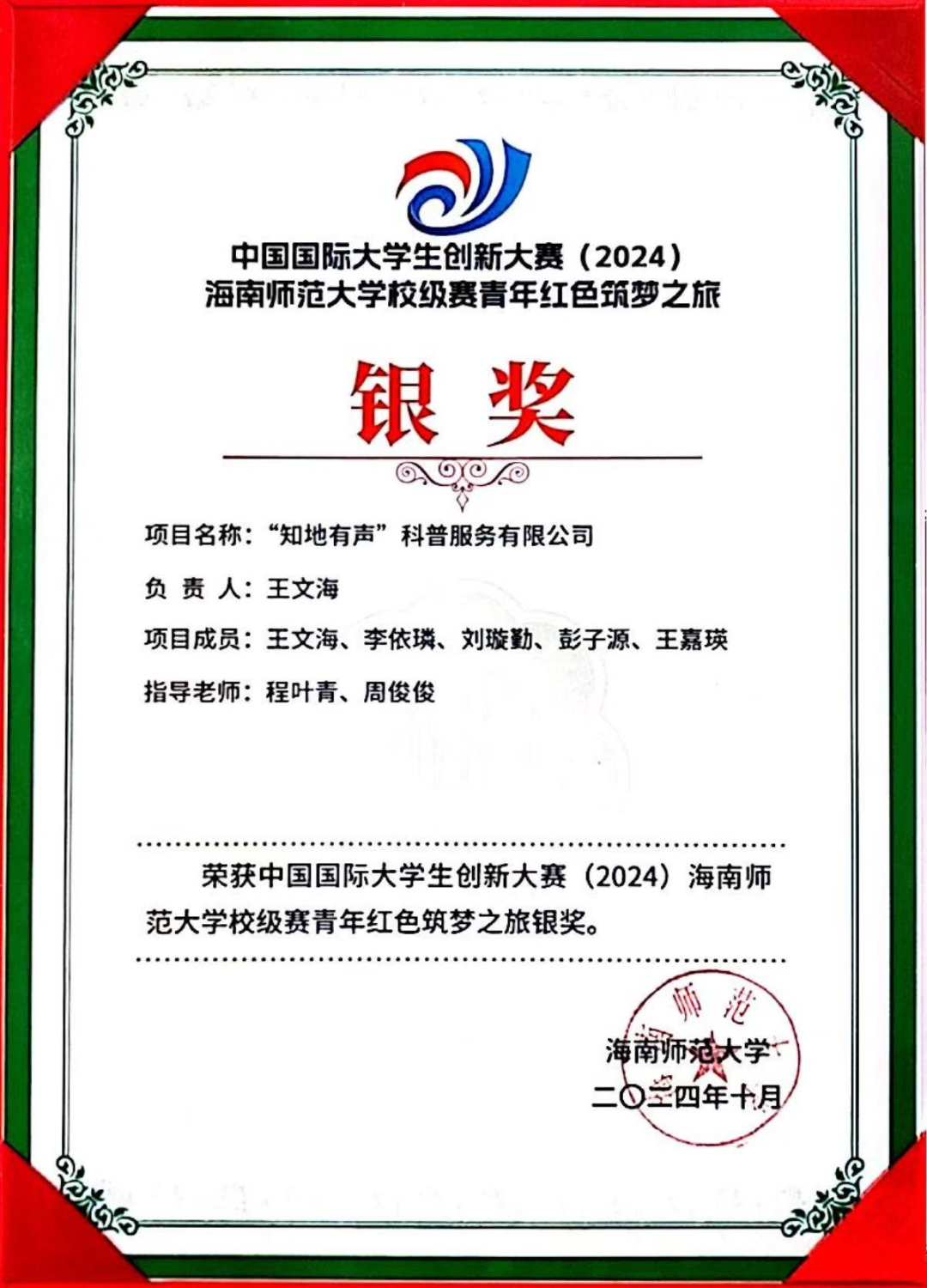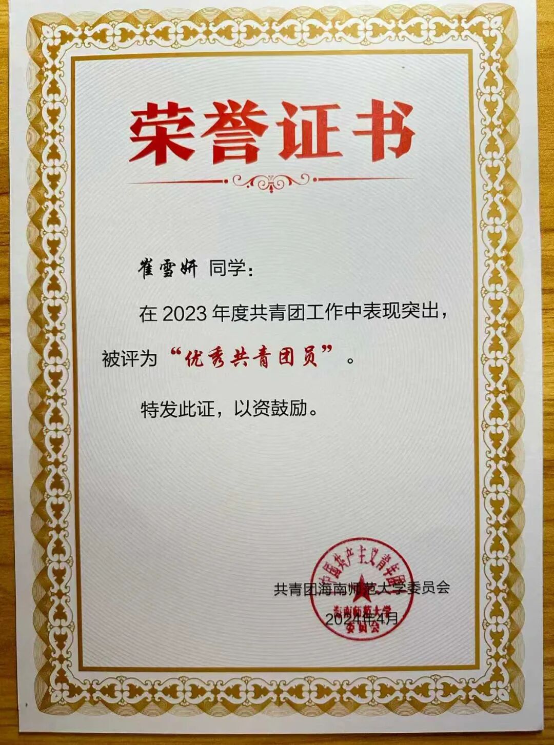 一.王文海 王文海同学: 女,地理与环境科学学院地理信息科学专业2023级学生,专业绩点4.01,排名第一。 获奖经历: 国家励志奖学金 两次获得校级优秀三好学生 两次获得中国国际大学生创新大赛校级银奖 “三下乡”社会实践“优秀学生” 中科院天山冰川所科研实习中 获“最佳汇报一等奖” 校级“银奖志愿者” 高中时期,王文海的书桌上总是堆满各式地图。在等高线的脉络和气候图的色块中,这份对于地理的纯粹热爱,成为她求学路上的不竭动力。进入大学后,她始终保持着对知识的敬畏与渴求。大学两年间,她以4.01的绩点位列专业第一,先后荣获国家励志奖学金、校级优秀三好学生等荣誉。那个曾经在地图前浮想联翩的孩子,如今已学会用专业知识和先进技术,真正去解读、去丈量、去守护我们赖以生存的山水与海洋。 她深知优秀的地理人既要“读万卷书”,更要“行万里路”。大一时,她便牵头组建团队参加中国国际大学生创新大赛。在项目中,她负责核心技术攻关,带领团队攻克了多个技术难题,连续两年荣获校级银奖和校级大创立项;随着专业学习的深入,自2024年9月起,她跟随导师参与国家自然基金项目的研究,投身海岸线演变研究。在过程中自学机器解译的原理方法,掌握了遥感数据处理的核心技术;在科研的道路上,她积极参与学术交流,钻研GIS技术与机器学习方法。这些宝贵的实践经历,让她深刻认识到:科研不仅要追求理论创新,更要服务社会需求。 荣誉是对过往耕耘的肯定,更是前行的底气。她始终以地理人的使命与担当,在丈量山河、探索海洋、守护生态的道路上步履不停,用专业与热爱书写属于青年学子的奋进篇章。 ▲中国国际大学生创新大赛海南师范大学校级赛青年红色筑梦之旅银奖 ▲2023-2024年度“优秀三好学生”(一等专业奖学金) 2025年暑假,王文海迎来科研道路上的重要突破——赴新疆参与中科院西北生态环境研究所天山冰川科研启航计划,在实践中完成对专业能力与科研素养的双重锤炼。 在冰川遥感组,她与团队利用高分辨率遥感影像为冰川编目建档,为每一处冰川精准“上户口”。攀登海拔四千米的乌鲁木齐河源1号冰川时,高原反应与凛冽寒风未能阻挡她的脚步,亲眼见证冰川消融痕迹,让她真切领悟到地理科研的使命与重量。在项目汇报中,她反复打磨内容架构与展示细节,从逻辑框架到图表呈现均精益求精。最终,她代表团队所作的学术汇报凭借研究扎实、表达清晰、逻辑严谨,在众多作品中脱颖而出,斩获“最佳汇报一等奖”。 此次新疆之行,让她成功实现从山川到海洋的科研贯通。在探究冰川变化与海平面关联机制的过程中,她逐步建立起地球系统科学整体观,以跨尺度、跨领域的研究视野,在地理科研之路上稳步前行。 ▲2023-2024年度国家励志奖学金 作为一名优秀的地理学子,大一期间,王文海积极参与“三下乡”社会实践,运用地理信息技术与专业模型评估农村养老需求,研究成果为地方政策制定提供重要参考,以实干彰显专业价值,以优异的表现荣获了社会实践“优秀学生”称号。 两年来,她积极参与志愿服务,累计服务248小时,获得银奖志愿者称号。从社区服务到科普宣传,从校园公益到社会援助,她在不同的志愿服务中践行着地理人的社会责任。回望大学时光,对地理的赤诚热爱、对未知的不懈探索、将个人理想融入国家发展的使命担当,始终是她前行的动力。从课堂钻研到科研实践,从山川考察到海洋探索,每份荣誉都是她脚踏实地、奋力拼搏的最好见证。 如今,她坚持研读中英文前沿文献,不断完善跨学科知识体系。从昔日在地图前憧憬海洋的学子,成长为立志投身海洋地质研究的青年科研后备力量。未来,她将继续以地理信息技术为依托,以山河海洋为舞台,在认识海洋、保护海洋、经略海洋的征程中坚定前行,绘制出属于青年一代的时代担当。 ▲2024暑期“三下乡”社会实践“优秀学生” ▲20223-2024“优秀三好学生”(一等专业奖学金) 二.崔雪妍 崔雪妍同学: 女,地理与环境科学学院地理科学专业2023级学生,中共预备党员,专业绩点4.17,排名第一。 获奖经历: 中国国际大学生创新大赛校级铜奖3项、优秀奖2项 连续两年获评校级“优秀三好学生” 连续两年获评校级“优秀共青团员” 2025“外研社·国才杯”“理解当代中国”全国大学生外语能力大赛校赛笔译赛项金奖 2025“外研社·国才杯”“理解当代中国”全国大学生外语能力大赛校赛综合能力赛项银奖 2025年大学生暑期文化科技卫生“三下乡”社会实践活动优秀调查报告(论文)校级二等奖 2024年“挑战杯”海南师范大学大学生创业计划竞赛优秀奖 校级“银奖志愿者” “心有所信,方能行远。”自递交入党申请书以来,崔雪妍始终将坚定理想信念作为立身之本。2023年9月,她郑重向党组织递交入党申请书;2025年12月,光荣成为一名预备党员。在理论学习的道路上,她主动学习党的创新理论,不断提升政治判断力、政治领悟力、政治执行力,并连续两年在团员教育评议中获评“优秀”等级。作为班级副团支书,她积极协助团支书开展主题团日与班级活动,主动关心同学思想动态,耐心沟通引导,助力同学们树立正确的世界观、人生观、价值观。她始终坚持将个人理想融入国家发展与民族复兴伟业,以实际行动践行青年使命。 在学业上,她始终秉持“勤能补拙,精