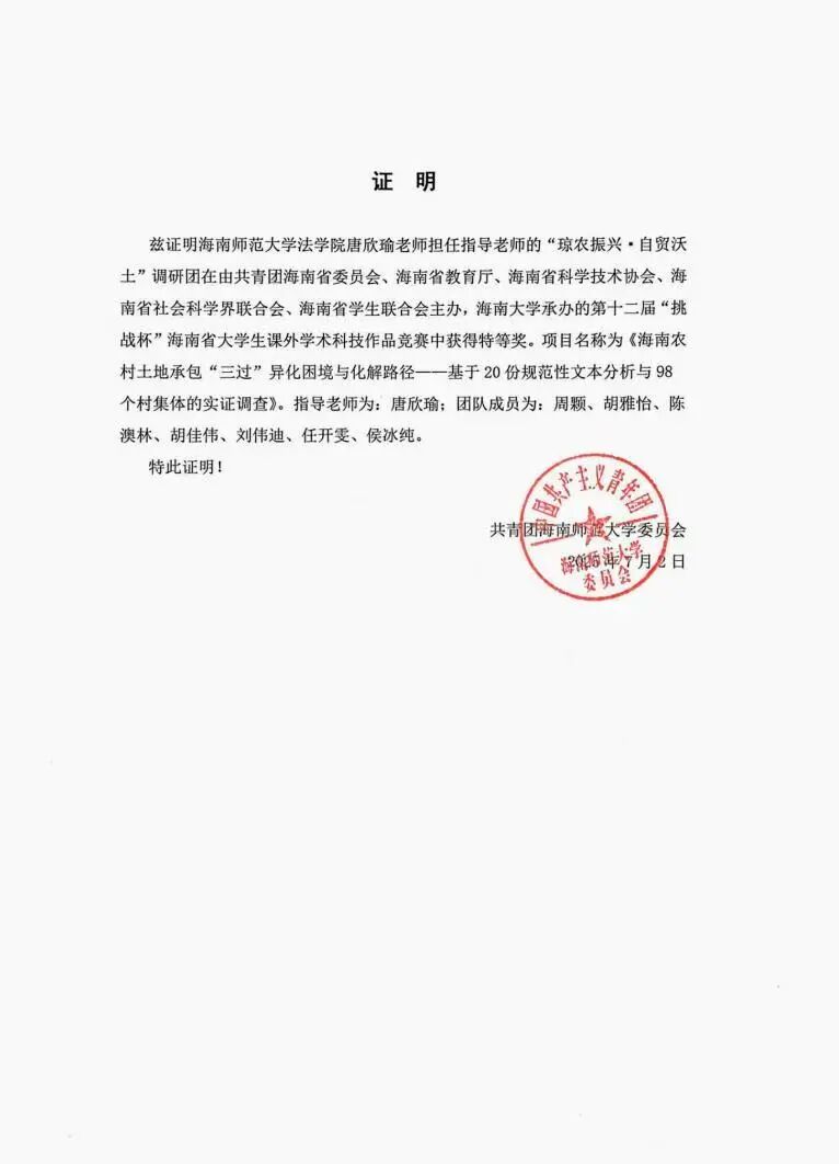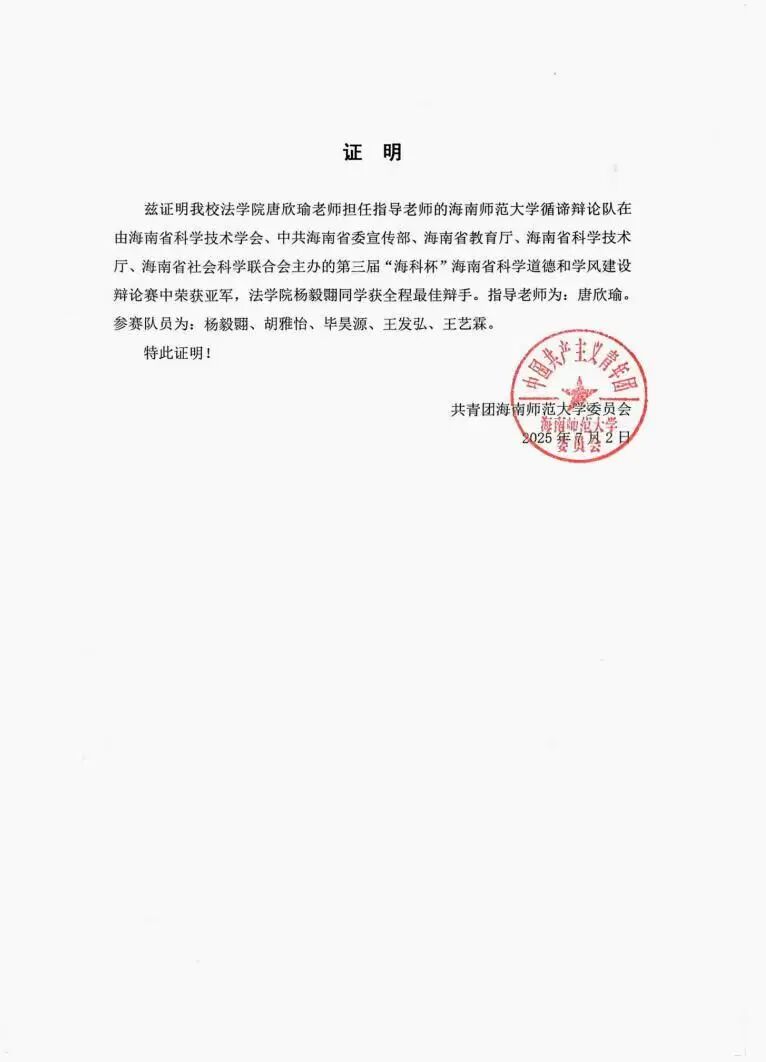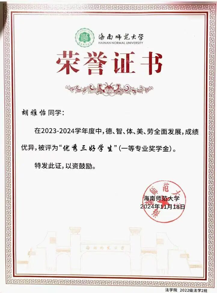 胡雅怡 胡雅怡同学: 女,共青团员,法学院 2022 级法学本科生,已推免至西南财经大学。现任2022级法学2班副班长,曾任法学院青协综合协调部副部长。 获奖经历: 第十二届“挑战杯”海南省大学生系列科技学术竞赛特等奖 海南省“科学道德和学风建设”团体亚军 “清朗杯”电视辩论赛双团体亚军 2023、2024 年海南师范大学专业一等奖学金 辞鉴(海口)律所助学金 优秀共青团干部 三下乡“优秀学生” 银奖志愿者 胡雅怡深知“扎实的理论是实践的前提”,始终将学业置于发展的核心位置,前六学期专业必修课成绩排名第一,前三学年平均综测排名第一,核心专业课程民法学、刑法学、法理学、刑事诉讼法学、民事诉讼法学成绩均为90分以上。英语方面,她以580分和514分通过大学英语四六级考试。她连续两年获专业一等奖学金及律所助学金,荣获“优秀三好学生”“优秀共青团干部”等称号,此外,她主动在课后拓展法律知识的深度与广度,翻阅法学经典著作,关注最新法律法规释义,阅读年度典型司法案例解读推文等。 ▲2023-2024“优秀三好学生”(一等专业奖学金) 法学注重理论与实践结合。胡雅怡积极投身课题研究与专业竞赛,锤炼法律思维,提升解决实际问题的综合能力。2024年7月起,她在唐欣瑜老师指导下作为核心成员调研农村土地承包“三过”(期限过长、面积过大、租金过低)问题,所提方案帮助万宁市南桥镇人民政府实际解决百余件纠纷,该课题获2025年6月海南省第十二届“挑战杯”大学生系列科技学术竞赛省级特等奖并入围国赛。 作为法学生,胡雅怡也积极投身于各类辩论场,多次参加“海科杯”“清朗杯”等省级辩论赛,屡获团体亚军,在思辨交锋中提升专业素养。 ▲第十二届"挑战杯"海南省大学生课外学术科技作品竞赛 特等奖 ▲第三届"海科杯"海南省科学道德和学风建设辩论赛 亚军 “纸上得来终觉浅,绝知此事要躬行”,胡雅怡始终坚信“法学服务社会”,积极投身志愿服务与社会实践。 2023年,她担任法学院青协综合协调部副部长,参与包括第四届中国国际消费品博览会在内的十余项志愿活动,累计服务382小时,获评校级“银奖志愿者”。在“三下乡”社会实践中,她与团队深入临高惠丰村、美兰区新时代文明实践中心、琼海万泉中学等地,展开普法宣传活动,通过设立临时普法咨询点、发放普法手册、开展案例讲解与情景模拟等方式,普及法律知识。因表现突出,她获得了“三下乡优秀学生”称号。 扎根于法理沃土,驰骋于思辨赛场 以严谨构建专业根基 以热忱投身法治实践 愿每一位同行者都能以此为勉 不驰于空想,不骛于虚声 在权利与正义的道路上脚踏实地 以专业与担当书写法治时代的青春注脚。