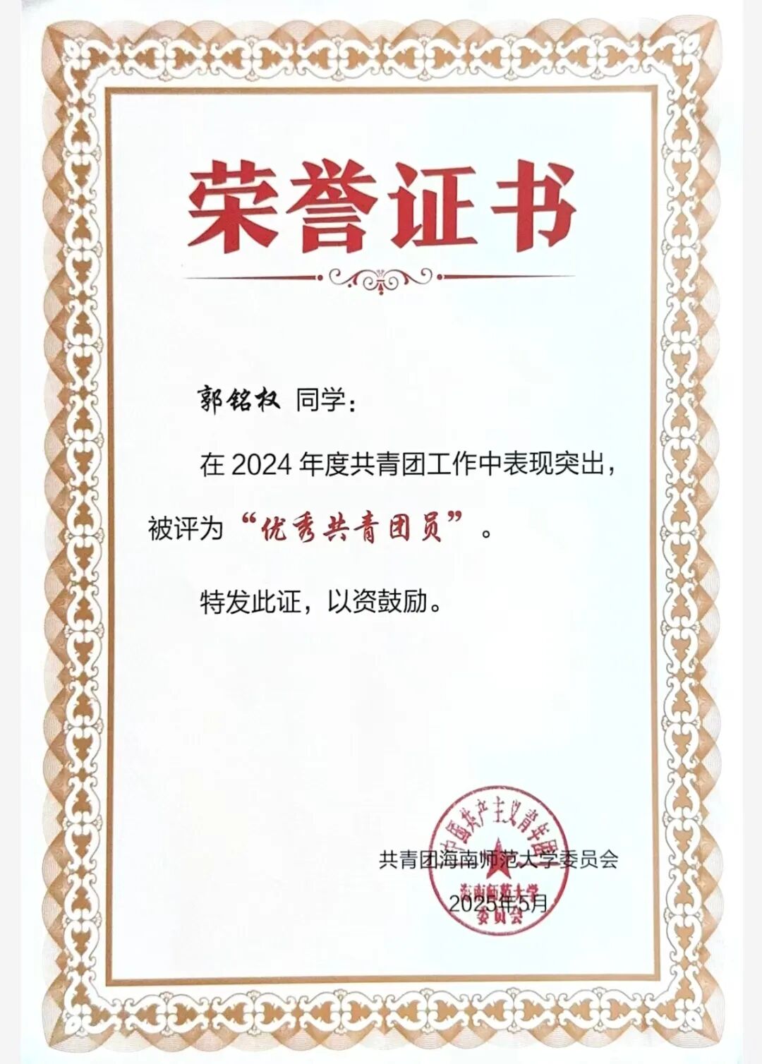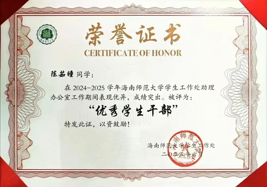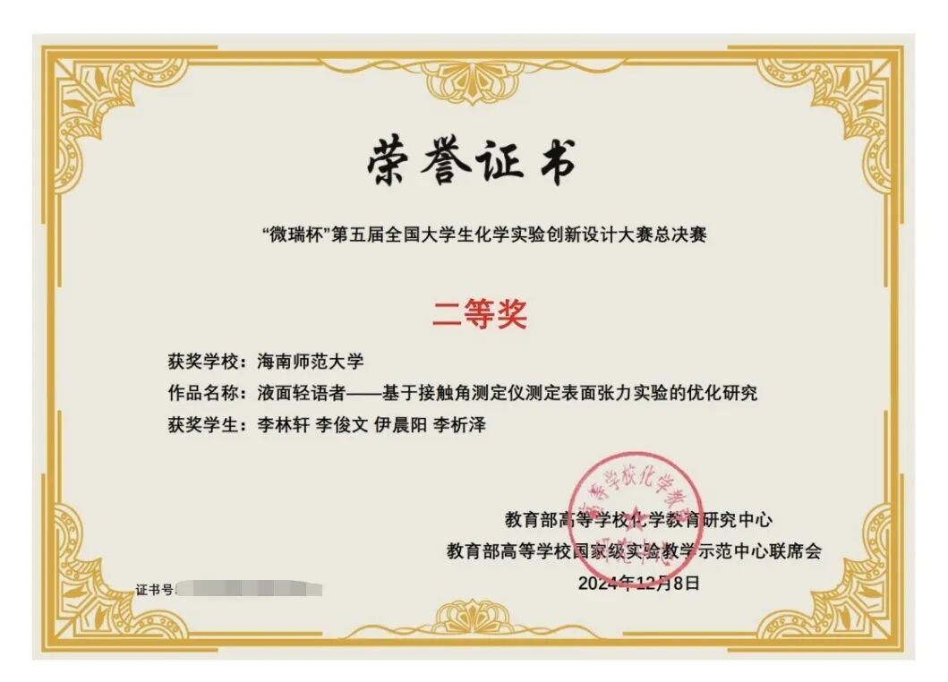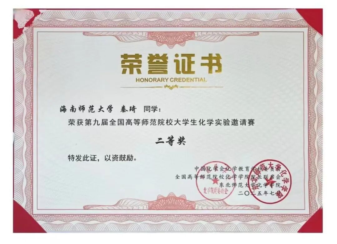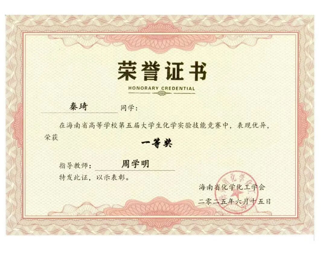 一.李林轩 李林轩同学: 海南师范大学化学与化工学院2022级制药工程专业本科生,中共党员。 获奖经历: 第十届全国大学生生物医学工程创新设计 竞赛国家级一等奖 第五届全国大学生化学实验创新设计大赛 国家级二等奖 第二届全国大学生职业规划大赛 省级金奖 第五届全国大学生化学实验技能竞赛 省级一等奖 国家奖学金 李林轩自入学起,便将“崇德尚学、求实创新”立为人生信条。她积极向党组织靠拢,认真参与党课学习和主题教育活动,并在疫情防控与台风灾后志愿服务中挺身而出,以实际行动践行党员初心。在班级中,她主动组建政治学习小组,担任学习委员推动学风建设,带领班级获评校级优秀集体,真正做到“一名党员,一面旗帜”。 学业上,她连续三年保持专业第一,平均绩点达4.17,多门核心课程成绩超过95分。她不仅注重专业知识积累,更主动突破语言壁垒,高分通过大学英语四、六级考试,并赴国际组织实习,拓宽全球视野。 她构建起“理论—工具—文献”三位一体的学习体系,熟练运用ChemDraw、Origin等专业软件,善用中外文献数据库,为科研创新奠定坚实根基。其严谨态度与综合能力使她连续两年荣获国家奖学金,并获评“校十佳学习标兵”。 依托海南丰富的热带药用资源,李林轩早早投身科研实践。她以“解决临床痛点”为导向,先后主持两项国家级大学生创新创业训练计划项目,围绕黎药胭脂、两面针的抗肿瘤活性成分开展系统性研究,完成从提取分离到活性评价的全流程探索,并发表多篇高水平论文。 她深知创新离不开协作。在各类竞赛中,她与团队成员反复打磨方案,深夜研讨成为常态,最终在全国大学生生物医学工程创新设计竞赛、化学实验创新设计大赛等赛事中斩获国家级、省级奖项14项。她的项目不仅关注科学发现,更强调应用转化,体现出鲜明的“产学研”融合思维。 在科研训练中,她参与新型铂类抗肿瘤药物研发课题,掌握了多项高级实验技能。她始终秉持“守正创新”理念,在扎实的化学基础上融入工程与医学交叉视角,形成了独特的科研创新能力,并在职业生涯规划大赛中摘得省级金奖,清晰勾勒出未来的科研发展路径。 ▲第十届全国大学生生物医学工程创新 设计竞赛国家级一等奖 ▲第五届全国大学生化学实验创新设计 大赛国家级二等奖 李林轩坚信,所学当为所用。她积极投身志愿服务,在中国国际消费品博览会担任志愿者展现专业素养,深入五指山乡村开展药学科普宣讲,将知识送至田间地头。她累计无偿献血400ml,荣获省级“无偿献血公益青年”称号,以热血传递奉献精神。 在学生工作中,她以身作则,不仅个人卓越,更致力集体共进。她创建的“学习互助小组”有效提升了班级整体学业水平,她乐于分享实验经验与学习资料,成为同学们信赖的“引路人”。她的奉献精神与组织能力赢得师生广泛赞誉。 生活中,她自律而热情,坚持运动,亲近自然,以积极心态感染身边每一个人。如今,她已获直博资格,将赴湖南大学继续深造,立志在“AI辅助蛋白设计”领域深耕探索。她的成长轨迹,生动诠释了当代青年如何将个人理想融入时代发展,在求真与奉献中书写绚烂青春。 二.秦琦 秦琦同学: 海南师范大学化学与化工学院2022级化学专业本科生,共青团员。 获奖经历: 第九届全国高等师范院校大学生化学实验 邀请赛国家级二等奖 海南省高等学校第五届大学生化学实验技能 竞赛省级一等奖 第十六届全国大学生数学竞赛(非数学A类) 省级一等奖 国家奖学金 🔻向下滑动文本查看人物经历 秦琦自入学以来始终以“踏实求学、勤勉探索”为准则,在学业上深耕细作,筑牢专业根基。面对化学专业繁杂的课程体系,她始终保持严谨认真的态度,力求“把每一个知识点学透、每一门课程学扎实”。针对有机化学等核心课程,她采用“思维导图+错题整理”的方法系统梳理,多门课程成绩稳定在90分以上,展现出扎实的学术功底。 她深知语言能力是科研的关键工具,从大一起坚持每日晨读专业英语词汇,通过系统积累,顺利通过大学英语四、六级考试,具备独立阅读英文文献与准确翻译实验步骤的能力,为后续科研参与打下坚实基础。凭借在学业上的持续努力与优异表现,她获评校“优秀三好学生”称号,成为师生眼中“基础扎实、态度端正”的典范。 怀揣对科研的敬畏与热情,秦琦自大一起便主动加入课题组,学习实验技能。在挑战杯项目中,为优化工艺参数,她长时间驻守实验室跟踪数据,历经数十次尝试,最终成功制备出对Cr(VI)污染土壤具有良好修复效果的复合材料。她独立负责一项吸附机理研究,完整完成从实验设计、数据分析到论文撰写的全过程,反复修改打磨,展现出严谨的科研素质与执行力。 在竞赛领域,她同样锐意进取。她参加全国大学生数学竞赛,从首次参赛获省三等奖到次年斩获省一等奖,背后是每周数小时的刷题总结与持续反思。在化学实验技能竞赛中,她凭借规范操作与扎实的数据分析能力,连续两年获海南省一等奖,并代表海南参加全国赛,荣获国家级二等奖。她还跨领域参与计算机类赛事,独立制作化学教学微课,获得省二等奖。至今,她已以第一作者与第三作者身份发表学术论文,并参与一项国家发明专利申请,实现了从学习者到创新者的跨越。 ▲第九届全国高等师范院校大学生化学 实验邀请赛国家级二等奖 ▲海