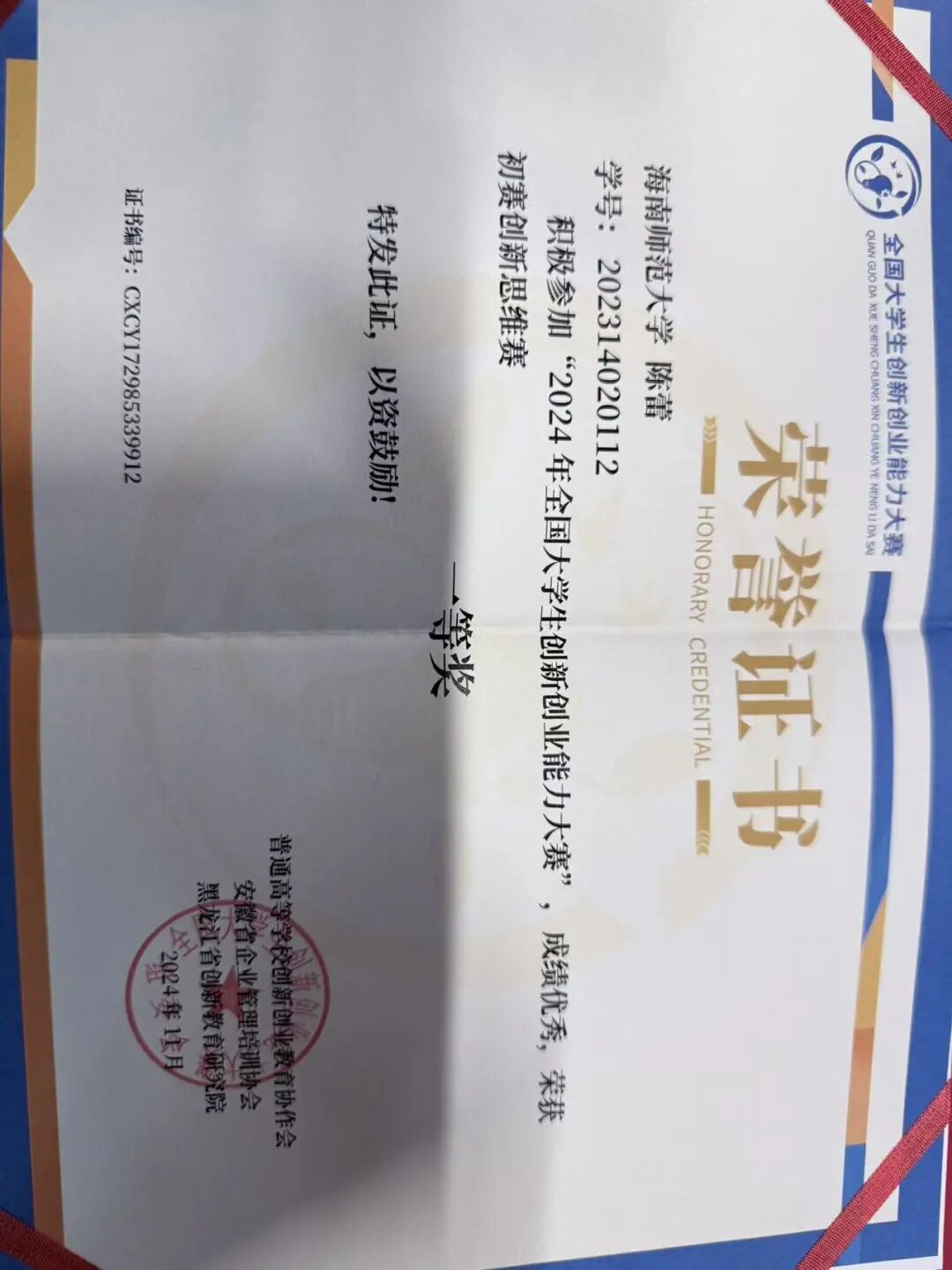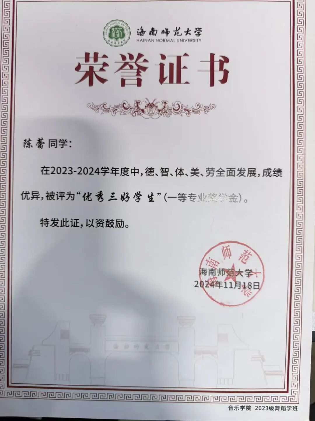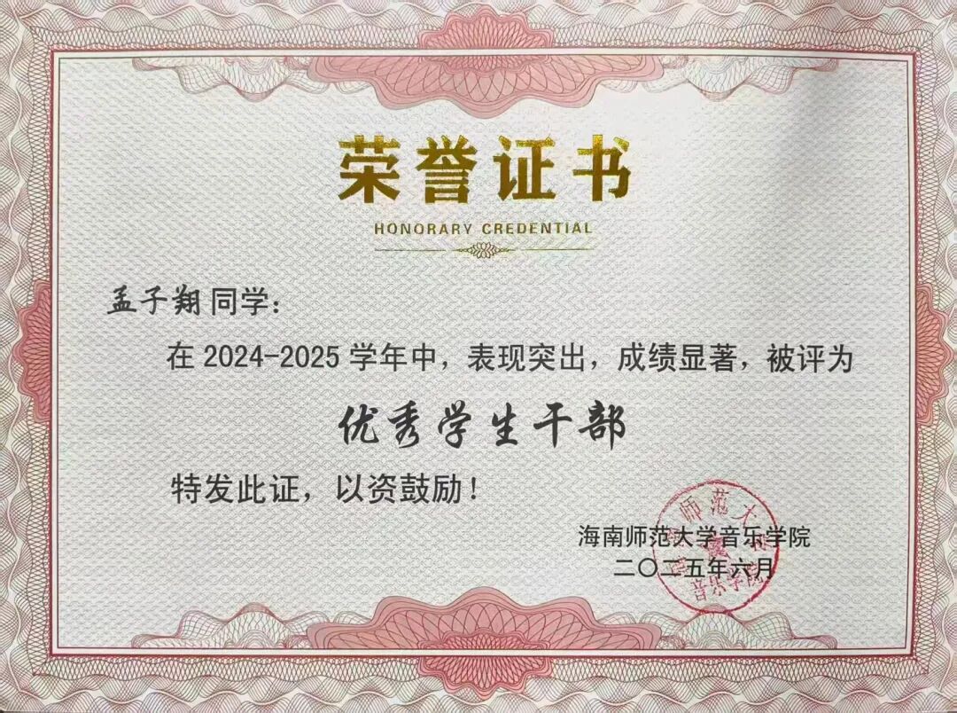一.陈蕾 陈蕾 女,共青团员,音乐学院舞蹈学专业2023级本科生。 获奖经历: 全国大学生创新创业能力 大赛初赛(创新思维赛)一等奖 海南师范大学第一届“理解当代中国” 英文短视频大赛三等奖 音乐学院第一届“响渔椰风·舞韵” 十佳舞者大赛“十佳舞者季军” 海口市“国家文化与自然遗产日”系列活动 《黎族家园》专场演出“优秀演职人员” 海南师范大学建校75周年校庆文艺风采奖 国家励志奖学金 校级一等奖学金 优秀三好学生 国家奖学金 清醒的思考与坚定的信仰,让陈蕾在成长道路上步履从容。作为一名积极向党组织靠拢的共青团员,她始终将理想信念放在首位,深入学习党的创新理论,积极参与“青年大学习”和主题团日活动,把对党的热爱转化为服务同学、奉献集体的实际行动。在班级中,她以“团结奋进、服务同学”为宗旨,协助班委组织策划“红色舞蹈故事分享会”“党史知识竞赛”等思想教育活动,带动身边同学共同进步,用青春热忱诠释新时代青年的理想与担当。 ▲优秀三好学生荣誉证书 学业与艺术是学生的立身之本。陈蕾在舞蹈专业领域始终保持着“攀登者”的姿态。2023–2024学年,她以专业综合测评第一的成绩,荣获“优秀三好学生”称号和校级一等奖学金,连续两年稳居专业第一。她的优秀不仅体现在成绩单上,更在舞台与实践中熠熠生辉——在“响渔椰风·舞韵”十佳舞者大赛中荣获季军,在校庆75周年文艺演出中摘得“校庆文艺风采奖”,以扎实的舞技和饱满的舞台表现力赢得广泛认可。 ▲全国大学生创新创业能力大赛一等奖 她勇于跨界融合,在竞赛中锤炼综合素养。参加“理解当代中国”英文短视频大赛,以舞蹈讲述中国故事,获校级三等奖;在全国大学生创新创业能力大赛中,凭借创新思维与团队协作,斩获初赛一等奖。她坦言:“竞赛不是目的,而是过程——它教会我们在压力中思考,在合作中成长。”她以“舞者+创新者”的双重身份,展现了新时代艺术学子的多元可能。 “用舞蹈传递文化,用行动践行责任”,是她不变的初心。她累计志愿服务时长逾355小时,作为“椰苗美育工程”志愿者,深入中小学开展舞蹈美育教学,点燃孩子们的艺术热情;在陵水黎族自治县社区教育公益班中,她将黎族传统“竹竿舞”融入课堂,让非遗文化“活”起来。2025年,她参演海口市“国家文化与自然遗产日”专场演出《黎族家园》,展现民族文化魅力,获主办方表彰;同年,她远赴意大利参加国际舞蹈英才大赛,与全球舞者交流切磋,将中国舞蹈之美带向世界舞台。她以青春之力传递温暖,以艺术之光书写担当,获评“优秀志愿者”。 二.孟子翔
