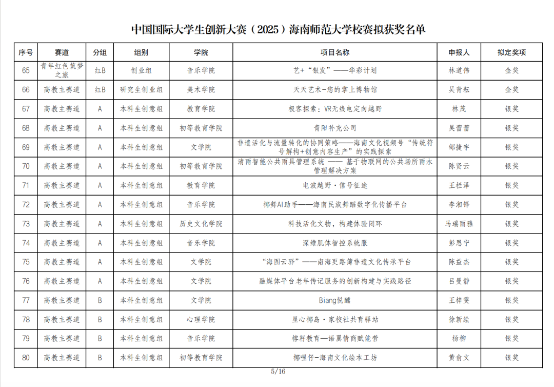 三.杨柳 杨柳 女,中共党员,音乐学院2022级音乐表演专业学生 获奖经历: 中国国际大学生创新大赛校赛银奖、省级金奖 第五届中国国际消费品博览会“优秀志愿者” 国家励志奖学金 暑期社会实践优秀学生 优秀学生干部 优秀共青团员 青春的底色,始于信仰的扎根。作为一名中共党员,杨柳将思想建设视为成长的“精神引擎”。她积极参与“青年马克思主义者培养工程”,推动理论学习走深走实。从入党积极分子到正式党员,她始终以服务集体为己任,协助组织主题党日与理论学习,获评“优秀学生干部”“优秀共青团员”。 “立身以立学为先,立学以读书为本。” 在音乐表演的专业领域,杨柳始终保持着精益求精的态度,以勤为径,深耕不辍。课堂上专注钻研,课后刻苦练习,她的学业成绩始终名列前茅,2024-2025 学年更是以专业第一、综合考评第一的优异成绩脱颖而出,荣获校级一等奖学金。 为全面提升综合素养,她主动参与口才训练营项目,系统学习语言表达、逻辑思维与临场应变技巧。通过反复的模拟宣讲、即兴演讲训练,她的表达能力显著提升,不仅在各类宣讲比赛中从容展现风采,更将语言功底融入专业表演,让舞台表达更具感染力与共情力。 三年来,她的专业课平均成绩稳步提升,16 门必修课全部及格,顺利通过英语四级、计算机二级等基础能力考核,钢琴、声乐等专业技能更是日臻成熟。 在竞赛舞台上,她同样大放异彩:第八届全国大学生艺术展演一等奖、中国国际大学生创新大赛校赛银奖、海南省 “新青年,大学习” 宣讲员选拔赛优秀奖等诸多荣誉,是她专业实力与综合素养的最佳佐证。每一份成绩的背后,都是她对艺术的执着追求,对自我提升的不懈探索 ▲创新创业大赛获奖 “纸上得来终觉浅,绝知此事要躬行。” 杨柳始终以 “奉献、友爱、互助、进步” 为准则,将志愿服务作为践行青年担当的重要途径,累计服务时长达 566 小时。 2024 年 9 月,她参与十四届中国国际数字出版博览会志愿服务,以细致周到的服务保障展会顺利开展;2025 年 4 月,在第五届中国国际消费品博览会上,她用专业高效的表现获评 “优秀志愿者”;暑期 “三下乡” 社会实践中,她深入基层、锤炼成长,凭借突出表现被评为 “暑期社会实践优秀学生”。从大型展会到基层一线,她用脚步丈量奉献之路,在实践中书写青春担当。 信仰指引方向,专业筑牢根基,实践成就成长。杨柳同学以中共党员的忠诚担当、以音乐学子的专业坚守、以青年志愿者的无私奉献,在大学时光里不断突破自我、追求卓越。国家励志奖学金、优秀学生干部、优秀志愿者等诸多荣誉,正是她青春最耀眼的注脚。 每一滴汗水,都在雕琢时光的纹理每一次跨越,都在定义青春的刻度他们在各自热爱的领域里,奔赴属于自己的高峰愿这份向上的力量如星火燎原不骛于虚声不惑于繁杂以笃行丰盈岁月以奋斗礼赞韶华