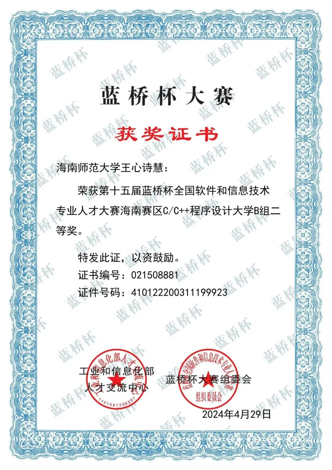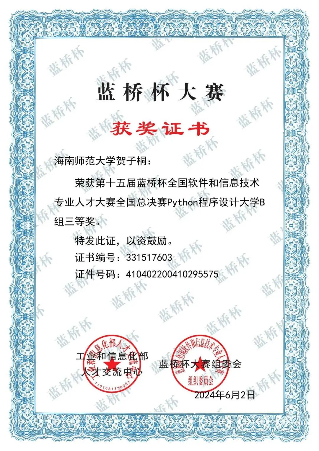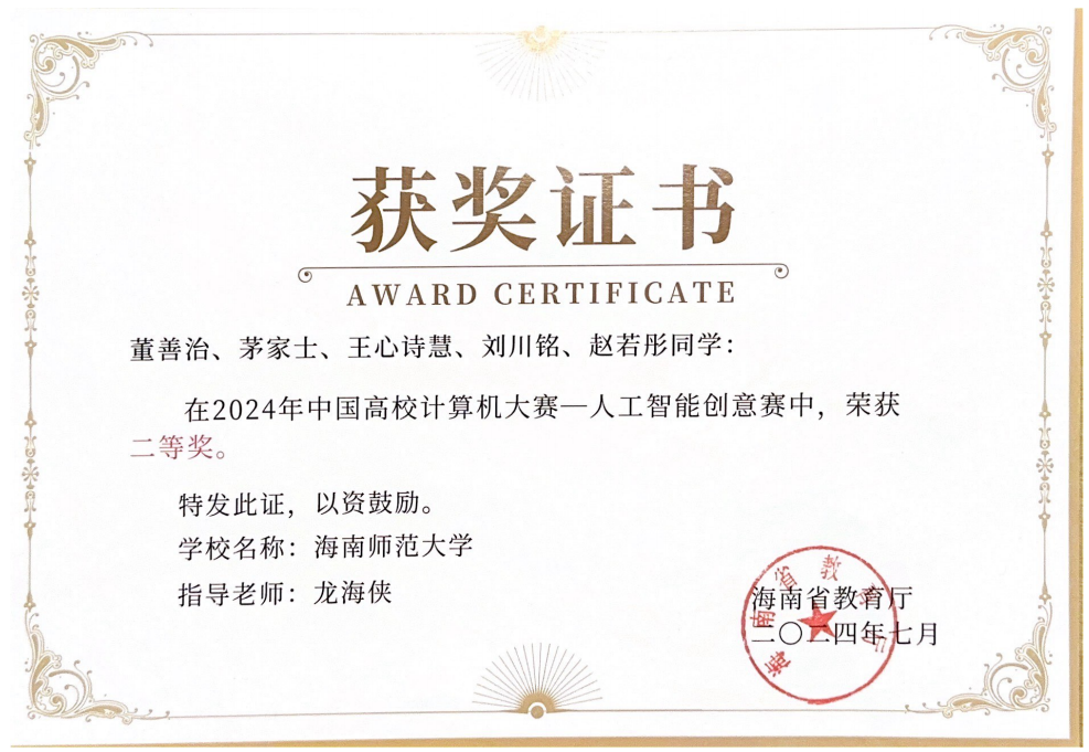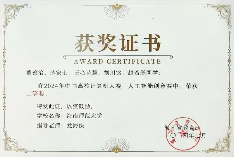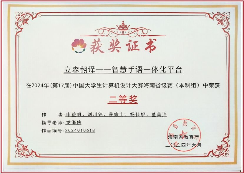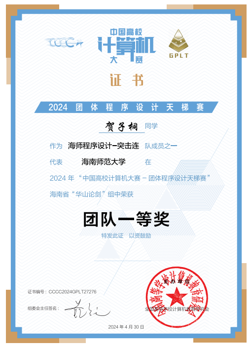 竞赛场上,他以热爱为帆破浪前行。作为学校参赛主力,他在中国大学生计算机设计大赛、蓝桥杯等全国赛事中屡获佳绩,斩获国赛三等奖、铜奖等荣誉,更在团体程序设计天梯赛中夺得海南省一等奖。备赛时与队友并肩作战,从问题分析到分工协作,他在团队碰撞中激发创意,在挑战中学会高效配合,让每一次竞赛都成为突破自我的阶梯。