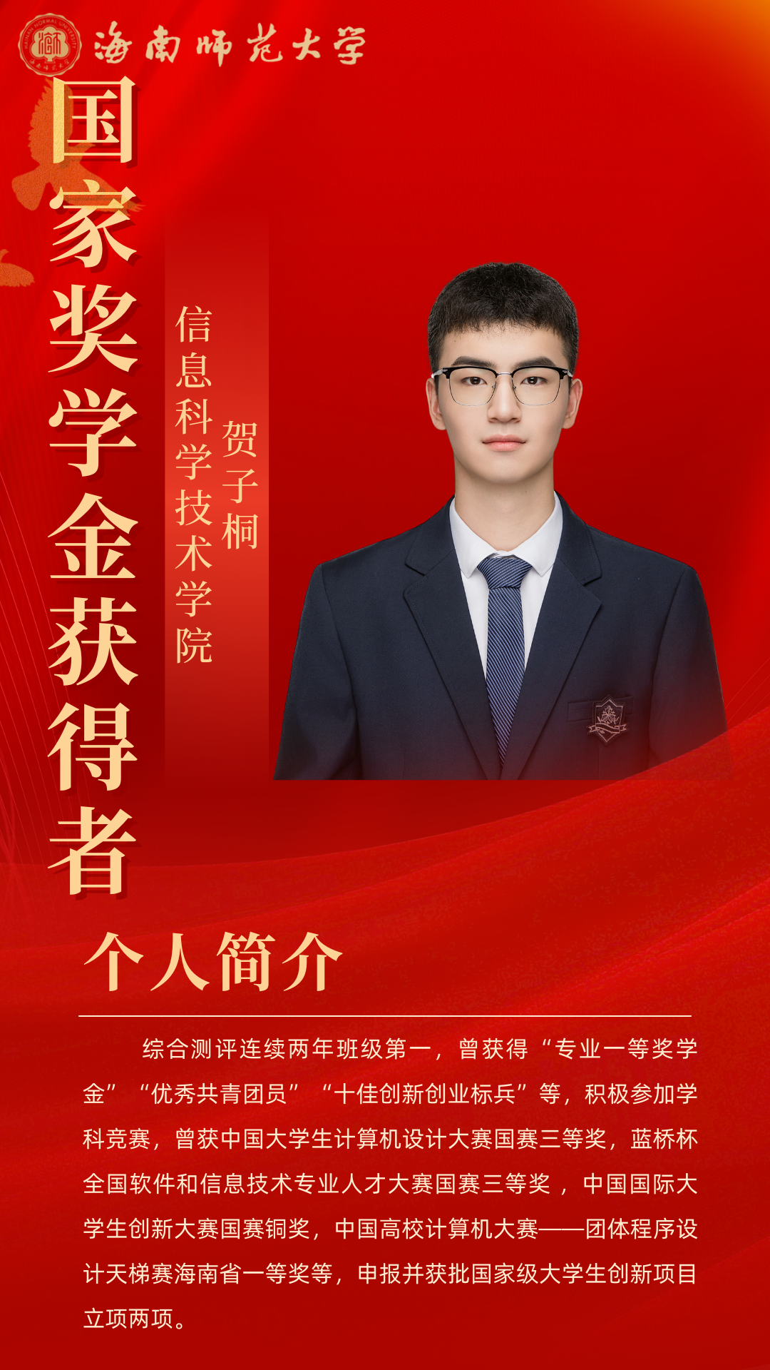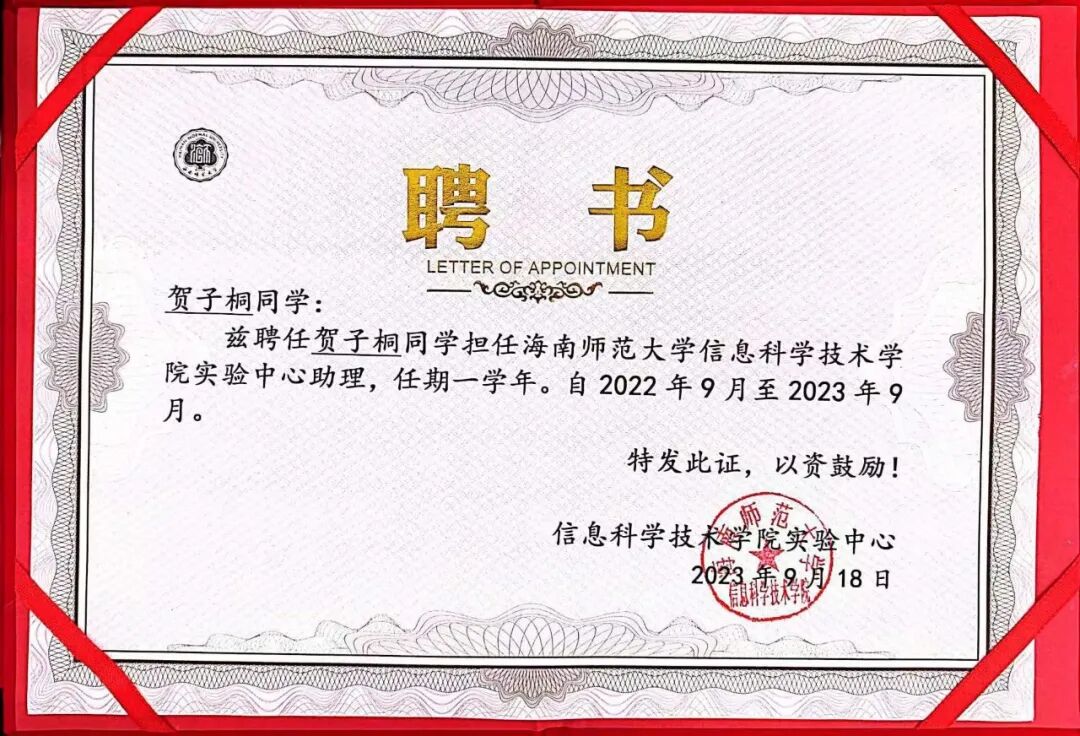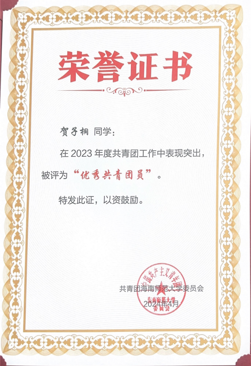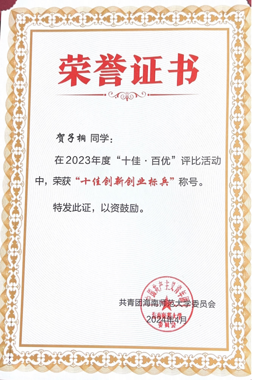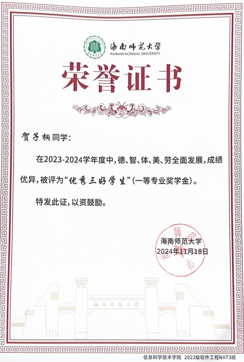 深耕青壤,征浪绽花。在海南师范大学信息科学技术学院,2022 级软件工程(NIIT)三班的贺子桐以行动诠释着青年担当。这位共青团员兼班级学习委员,用勤奋深耕学业,以热爱投身竞赛,凭热忱服务集体,在逐梦路上书写着属于自己的青春答卷。