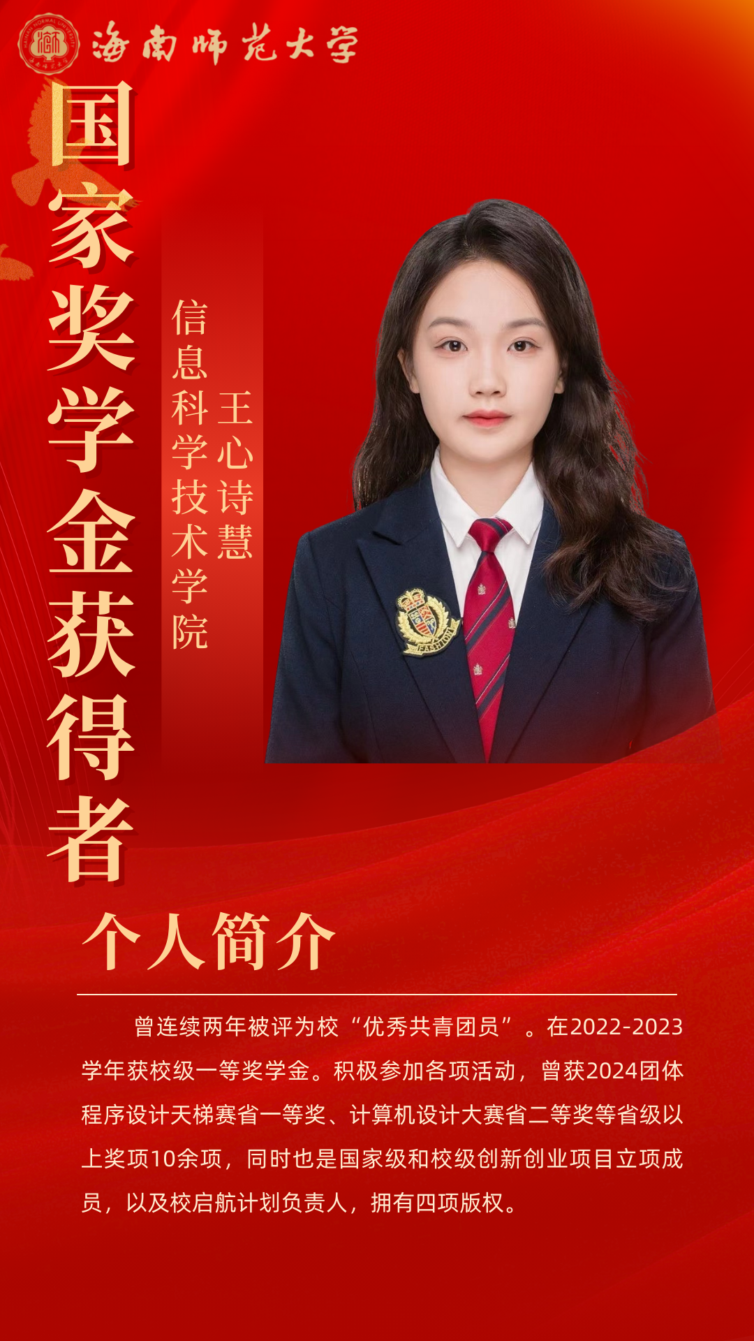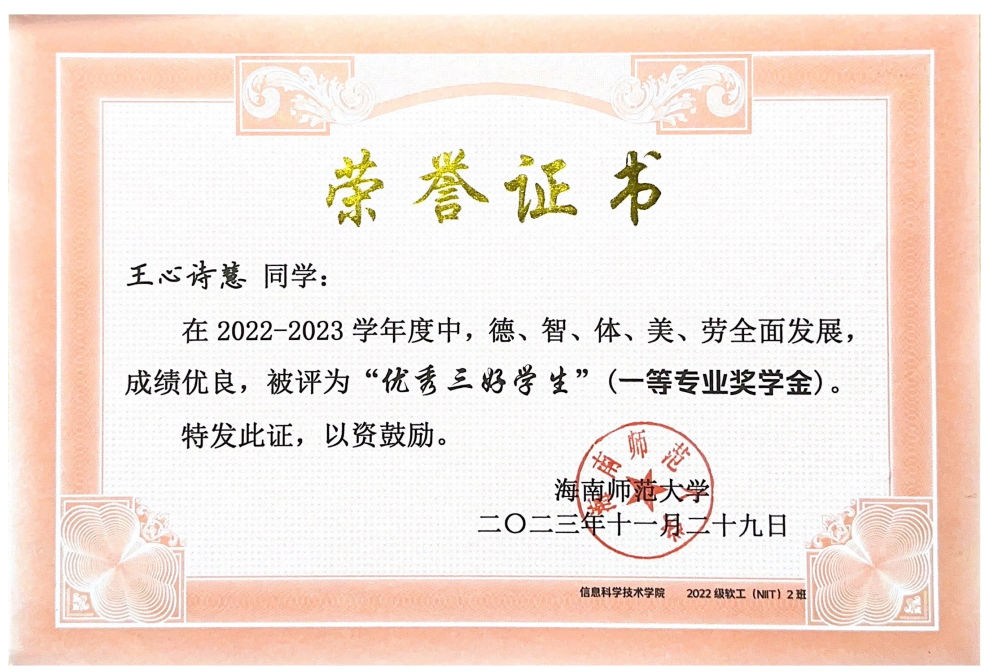 勤耕青阶,星浪攀峰。在海南师范大学信息科学技术学院,2022 级软件工程 2 班的王心诗慧,以 “道阻且长,行且将至” 为信念,在学业、实践与服务中书写着多元精彩。这位共青团员兼学习委员、班主任助理、教务处助理,用行动诠释着新时代青年的奋斗底色与责任担当。