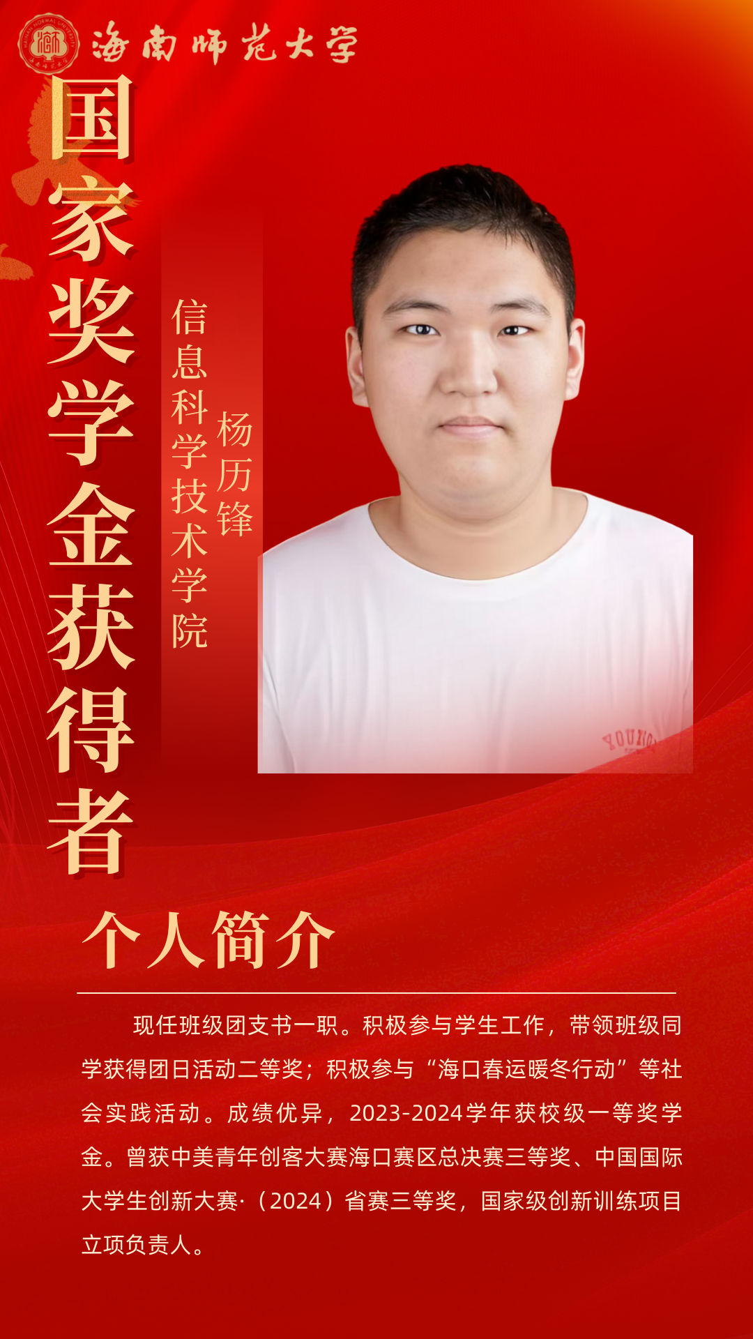 信仰燃光,实践铸翼。在海南师范大学信息科学技术学院,2023 级软件工程(NIIT)3 班的杨历锋,以 “严于律己,宽以待人” 为人生准则,在思想、学业、实践与集体服务中诠释着新时代青年的责任与温度。