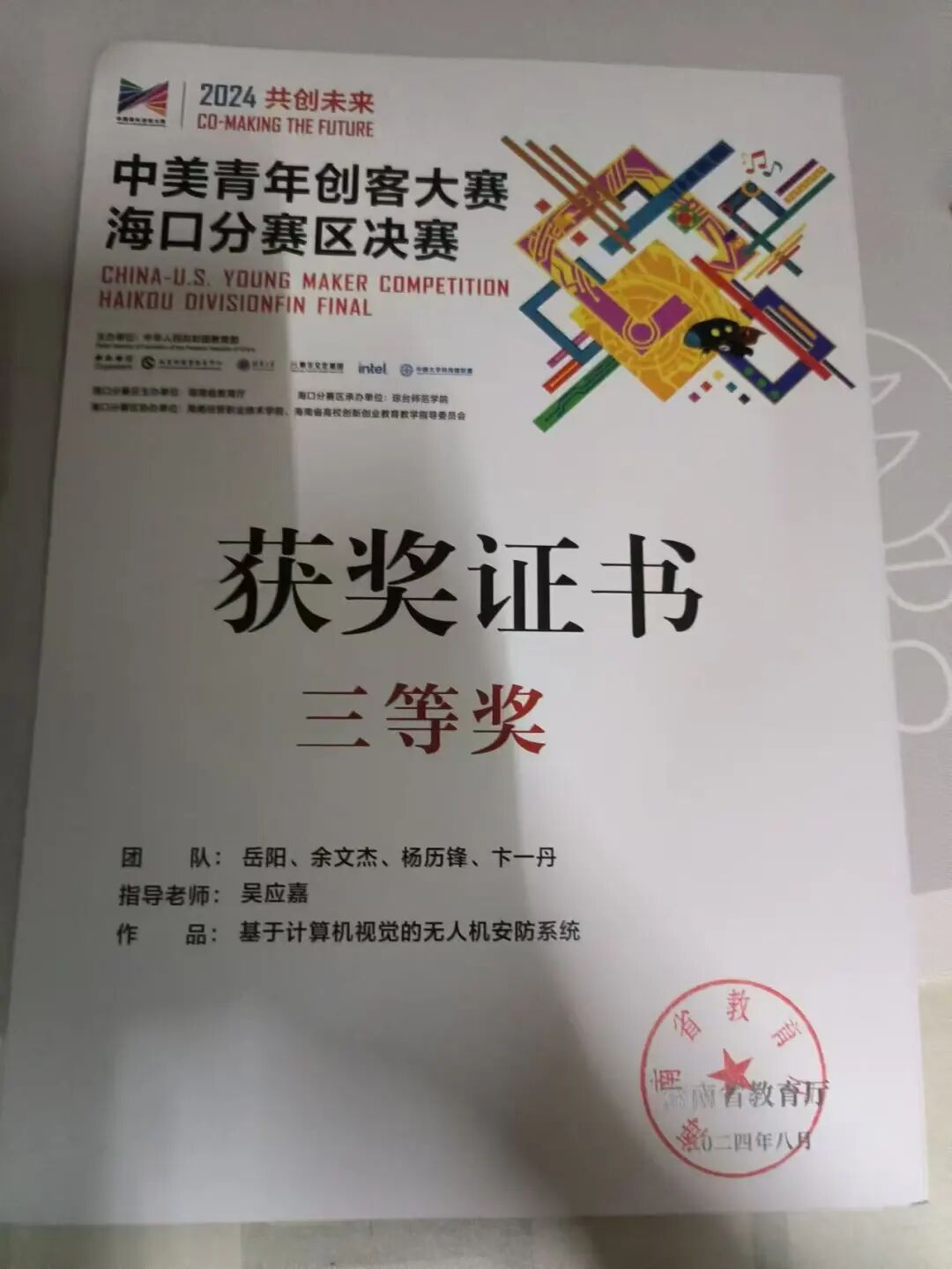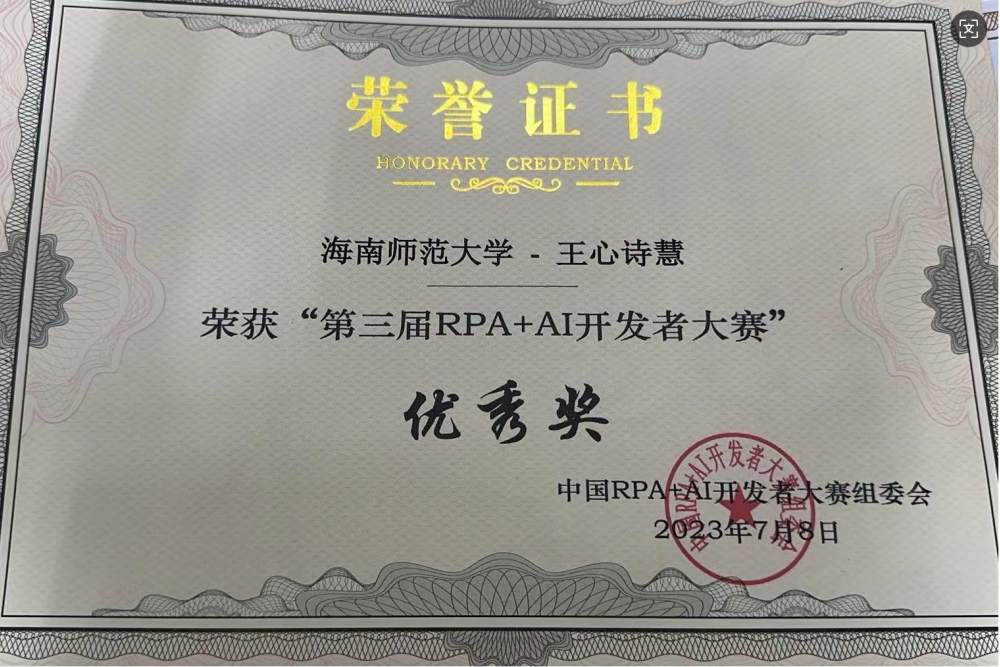 律己为尺,科创攀峰。学业为基,他以自律攀登专业高峰。2023—2024 学年,他以专业第二的学业平均分、第一的综合测评分获校级一等奖学金。课堂上积极互动,课后坚持 “每日小结 + 每周复盘”,独创 “跳读硬啃法” 破解自学难题 —— 遇阻不辍、反复研读,终在中美青年创客大赛、中国国际大学生创新大赛中分别斩获海口赛区三等奖与省级三等奖,并以国家级创新项目负责人身份带领团队攻坚。