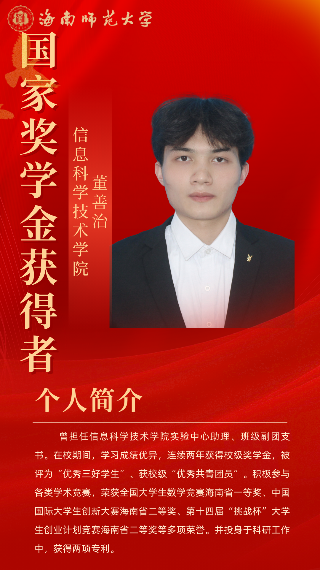 在逐梦的青春征途上,榜样的力量总是熠熠生辉,为我们照亮前行的道路。“海师微学工”微信公众号特别制作《国奖人物》专栏,通过展现2023-2024年度国家奖学金获得者的风貌,激励学子们锚定逐梦航向,扬起青春之帆。