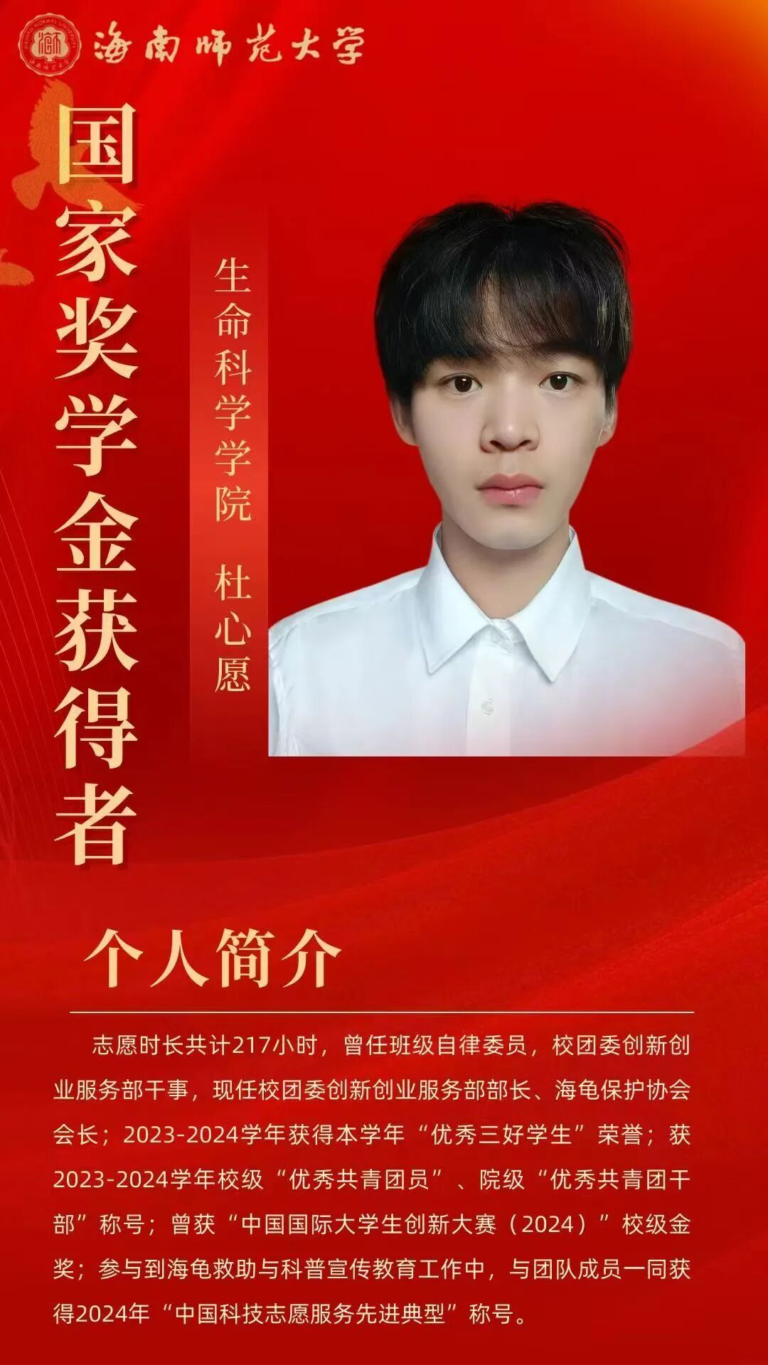 在逐梦的青春征途上,榜样的力量总是熠熠生辉,为我们照亮前行的道路。“海师微学工”微信公众号特别制作《国奖人物》专栏,通过展现2023-2024年度国家奖学金获得者的风貌,激励学子们锚定逐梦航向,扬起青春之帆。