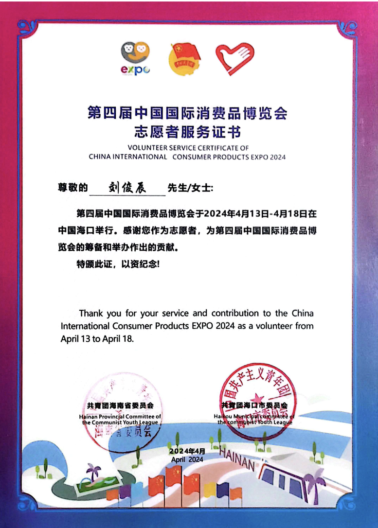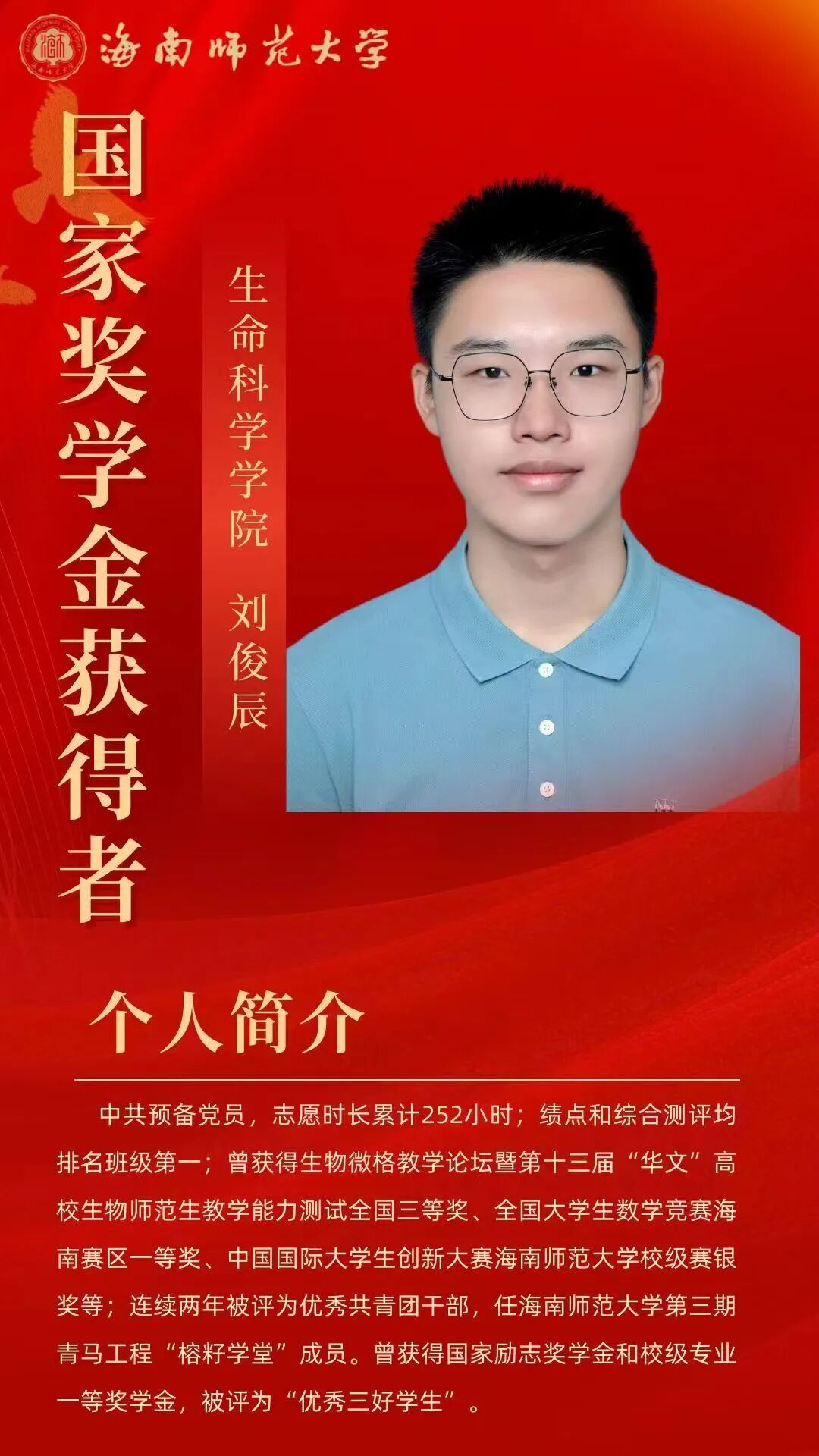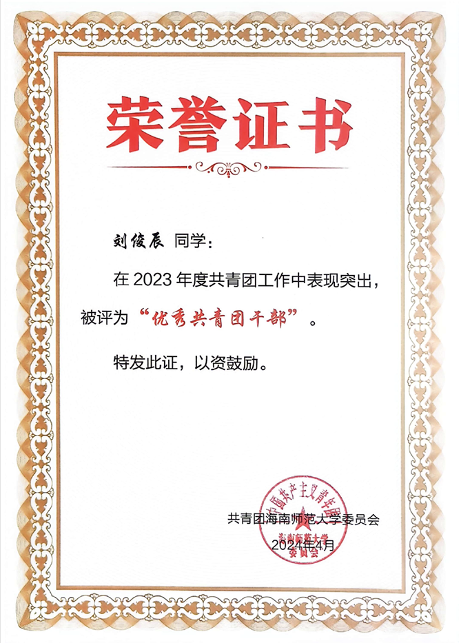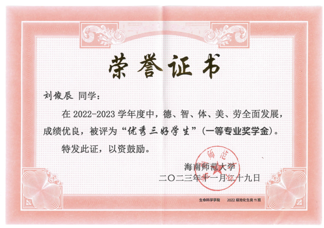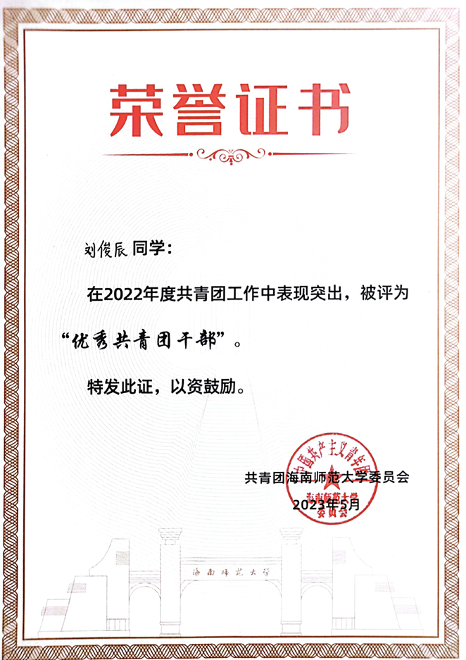 个人事迹 积微成著,厚积薄发。她学习刻苦努力,踏实认真,在校期间无挂科重修记录,学习成绩优异。曾获2022-2023学年度、2021—2022学年度国家励志奖学金;曾获海南师范大学2022—2023年度“优秀三好学生”及专业一等奖学金,海南师范大学2021—2022年度“三好学生”及专业二等奖学金。 她积极参与各类比赛竞赛,科研项目和社会实践活动,积累了丰富经验。曾获第八届大学生生命科学竞赛海南省二等奖、第十三届全国大学生电子商务“三创”挑战赛海南省三等奖、第十三届全国大学生电子商务“三创”挑战赛海南师范大学校赛二等奖、海南师范大学“献礼二十大,强国有我新征程”思政课展示三等奖、第九届中国国际“互联网+”大学生创新创业大赛海南师范大学校赛三等奖、“外研社·国才杯”英语写作大赛校赛三等奖等奖项。 热忱不息,服务绽芳。她在校期间积极热心投入参与各类志愿活动,用实际行动服务社会,始终牢记自己青年党员的身份和使命,用实际行动践行着自己的责任和担当。她曾参与第三届中国国际消费品博览会志愿活动,参与生命科学学院线上宣讲、环保塑料瓶回收等多项志愿活动,志愿时长248小时。学习获得了海南省急救医学培训心肺复苏普及培训证,曾获海南师范大学志愿服务“银奖志愿者”荣誉称号。她用双手传递善意,用真心服务社会,始终牢记青年党员的身份与使命,以实际行动践行责任担当,在奉献中书写着新时代青年党员的无悔华章。以青年党员的赤子之心,在服务社会的道路上踏出坚定的足迹,用一个个具体而微的善举,诠释着新时代党员的使命与担当。 理想铸魂,深扎信念根系。思想上,她理想信念坚定,拥护党的领导,理解认同党的纲领和章程,积极参与党和团的工作,有为实现中华民族伟大复兴的中国梦而奋斗终身,为党的共产主义伟大事业而奉献终身的决心。她积极参与各项学生工作。曾经担任校团委创新创业服务部部长、干事,还做过生命科学学院2023级生态班的班主任助理。 在共青团海南师范大学创新创业服务部工作期间,她组织策划了海南师范大学第十一届、十二届两届大学生教师技能大赛的开展,参与海南师范大学大学生职业能力培养“启航计划”系列活动的组织、参与组织海南师范大学“挑战杯”系列学术实践竞赛等各项团的工作。 在担任海南师范大学生命科学学院2023级生物科学类6班班主任助理期间,她协助班主任老师管理班级事务,解决班级内部的纠纷和问题,维护班级秩序。她为班级同学提供学业和生活方面的咨询和指导,关注学生的学习状态和心理健康,协助策划和组织班级的各种活动,并获得了海南师范大学“优秀共青团干部”,生命科学学院“优秀共青团干部”。 薛博文个人生活照 个人事迹 勤修素养,力拓思维疆域。自入学以来,他始终保持着出色的学习成绩,这不仅源于他日常的努力学习,更体现了他对知识的渴望和对科学的热爱。在课堂上,他认真听讲,积极发言,常常能够提出独到的见解,激发同学们的思考。在课外,他积极参加各类学科竞赛,力求将理论与实践结合,提升自己的综合素质。他曾获得生物微格教学论坛暨第十三届“华文”高校生物师范生教学能力测试全国三等奖、全国大学生数学竞赛海南赛区一等奖、中国国际大学生创新大赛海南师范大学校级赛银奖等,这些荣誉是他努力与坚持的见证。 他对高等数学情有独钟,他觉得在这个学科中,解决各种有趣的题目带来的满足感和快乐无与伦比。在大一的第一学期,他在高数考试中获得了期末满分的优异成绩,而在第二学期他则以97的成绩结束了自己的大一学年。由于对数学的浓厚兴趣,他乐于投入时间去深入研究,始终保持着积极的学习态度。 刘俊辰相关获奖证书 青衿赤诚,初心长萦。他大一时就积极向党组织靠拢提交了入党申请书,在大二下学期成为一名预备党员。他深知作为一名党员的责任与使命。他积极参与社会服务活动,始终将为人民服务作为自己的信念。他不仅关注自己的成长,更关心同学们的成长与进步。连续两年获得优秀共青团干部荣誉称号,成为我校青马工程“榕籽学堂”高级班成员,展现出他在思想政治工作中的杰出表现。 他还积极参与各类志愿服务和社会实践活动,身体力行地践行着志愿服务的理念。他参与了第四届中国国际消费品博览会的志愿服务活动,充分展现了海南师范大学学生的风采。作为志愿者,他认真负责,积极协助组织方处理各类事务,赢得了众多参展人员的赞誉。他不仅在校内参与活动,也在校外努力服务社会,展现了新时代大学生的责任感和使命感。 在个人成长的过程中,他始终保持谦逊与坚定。他深知,学习和成长的道路并不平坦,但他从未退缩,始终以积极的态度面对挑战。他的努力得到了认可,曾获得国家励志奖学金和校级专业一等奖学金,这些成就不仅是对他努力的肯定,更是对他未来发展的激励。 刘俊辰相关获奖证书 开放包容,拓宽交流之窗。他在班级管理和学校工作中同样表现出色。他连续三年担任班级学习委员,细心周到的工作让他成为同学们信赖的榜样。作为班级助理,他积极协助老师组织各类活动,充分调动班级的学习氛围,帮助同学们解决学习上的困难。他与老师、同学之间相处融洽,始终秉持着互帮互助的原则,让整个班级充满了团结的氛围。 他参与组织的活