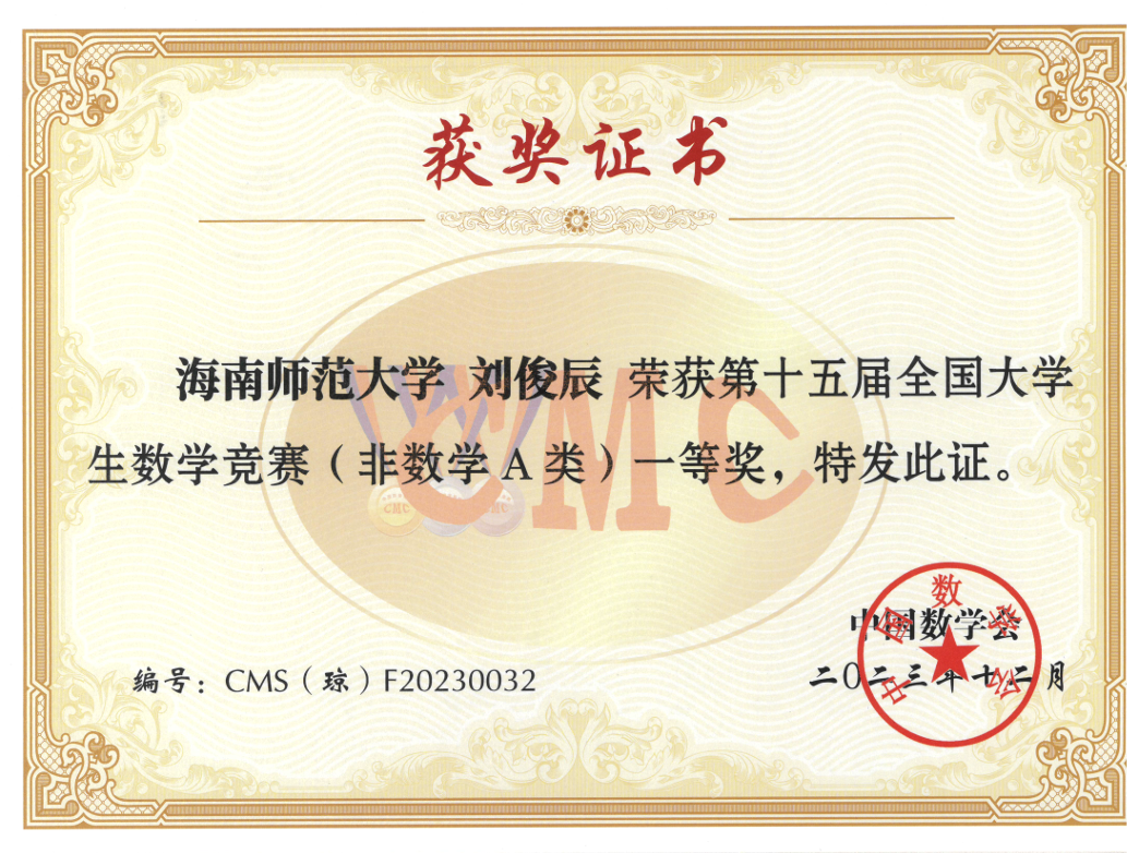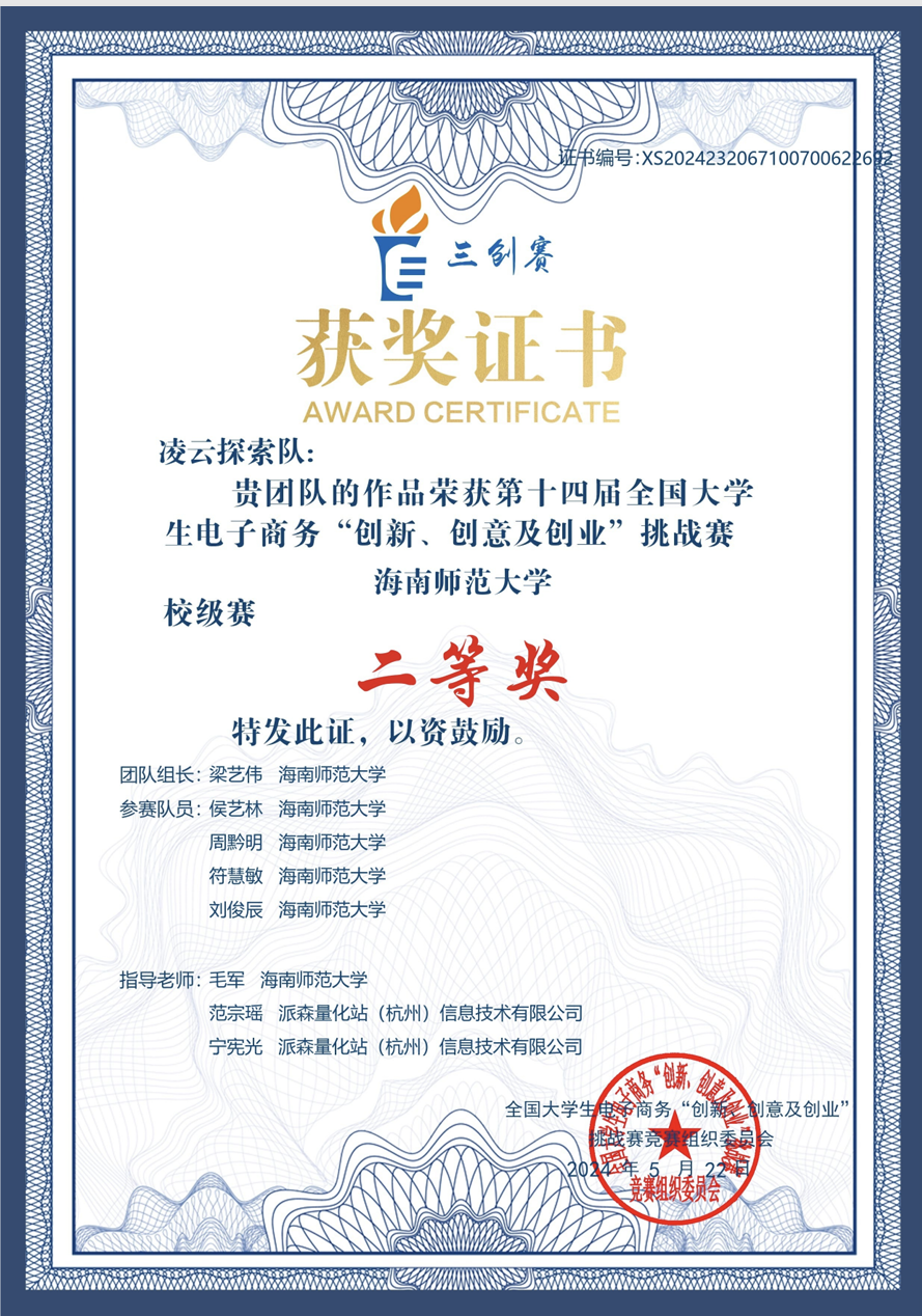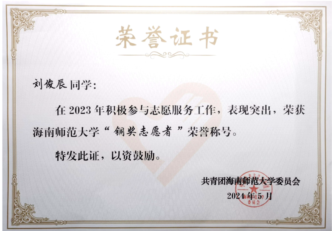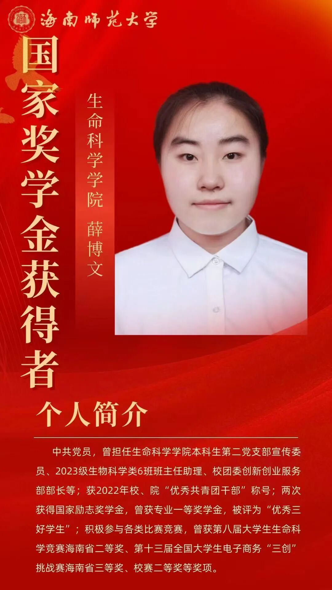 个人事迹 积微成著,厚积薄发。她学习刻苦努力,踏实认真,在校期间无挂科重修记录,学习成绩优异。曾获2022-2023学年度、2021—2022学年度国家励志奖学金;曾获海南师范大学2022—2023年度“优秀三好学生”及专业一等奖学金,海南师范大学2021—2022年度“三好学生”及专业二等奖学金。 她积极参与各类比赛竞赛,科研项目和社会实践活动,积累了丰富经验。曾获第八届大学生生命科学竞赛海南省二等奖、第十三届全国大学生电子商务“三创”挑战赛海南省三等奖、第十三届全国大学生电子商务“三创”挑战赛海南师范大学校赛二等奖、海南师范大学“献礼二十大,强国有我新征程”思政课展示三等奖、第九届中国国际“互联网+”大学生创新创业大赛海南师范大学校赛三等奖、“外研社·国才杯”英语写作大赛校赛三等奖等奖项。 热忱不息,服务绽芳。她在校期间积极热心投入参与各类志愿活动,用实际行动服务社会,始终牢记自己青年党员的身份和使命,用实际行动践行着自己的责任和担当。她曾参与第三届中国国际消费品博览会志愿活动,参与生命科学学院线上宣讲、环保塑料瓶回收等多项志愿活动,志愿时长248小时。学习获得了海南省急救医学培训心肺复苏普及培训证,曾获海南师范大学志愿服务“银奖志愿者”荣誉称号。她用双手传递善意,用真心服务社会,始终牢记青年党员的身份与使命,以实际行动践行责任担当,在奉献中书写着新时代青年党员的无悔华章。以青年党员的赤子之心,在服务社会的道路上踏出坚定的足迹,用一个个具体而微的善举,诠释着新时代党员的使命与担当。 理想铸魂,深扎信念根系。思想上,她理想信念坚定,拥护党的领导,理解认同党的纲领和章程,积极参与党和团的工作,有为实现中华民族伟大复兴的中国梦而奋斗终身,为党的共产主义伟大事业而奉献终身的决心。她积极参与各项学生工作。曾经担任校团委创新创业服务部部长、干事,还做过生命科学学院2023级生态班的班主任助理。 在共青团海南师范大学创新创业服务部工作期间,她组织策划了海南师范大学第十一届、十二届两届大学生教师技能大赛的开展,参与海南师范大学大学生职业能力培养“启航计划”系列活动的组织、参与组织海南师范大学“挑战杯”系列学术实践竞赛等各项团的工作。 在担任海南师范大学生命科学学院2023级生物科学类6班班主任助理期间,她协助班主任老师管理班级事务,解决班级内部的纠纷和问题,维护班级秩序。她为班级同学提供学业和生活方面的咨询和指导,关注学生的学习状态和心理健康,协助策划和组织班级的各种活动,并获得了海南师范大学“优秀共青团干部”,生命科学学院“优秀共青团干部”。 薛博文个人生活照 个人事迹 勤修素养,力拓思维疆域。自入学以来,他始终保持着出色的学习成绩,这不仅源于他日常的努力学习,更体现了他对知识的渴望和对科学的热爱。在课堂上,他认真听讲,积极发言,常常能够提出独到的见解,激发同学们的思考。在课外,他积极参加各类学科竞赛,力求将理论与实践结合,提升自己的综合素质。他曾获得生物微格教学论坛暨第十三届“华文”高校生物师范生教学能力测试全国三等奖、全国大学生数学竞赛海南赛区一等奖、中国国际大学生创新大赛海南师范大学校级赛银奖等,这些荣誉是他努力与坚持的见证。 他对高等数学情有独钟,他觉得在这个学科中,解决各种有趣的题目带来的满足感和快乐无与伦比。在大一的第一学期,他在高数考试中获得了期末满分的优异成绩,而在第二学期他则以97的成绩结束了自己的大一学年。由于对数学的浓厚兴趣,他乐于投入时间去深入研究,始终保持着积极的学习态度。 刘俊辰相关获奖证书 青衿赤诚,初心长萦。他大一时就积极向党组织靠拢提交了入党申请书,在大二下学期成为一名预备党员。他深知作为一名党员的责任与使命。他积极参与社会服务活动,始终将为人民服务作为自己的信念。他不仅关注自己的成长,更关心同学们的成长与进步。连续两年获得优秀共青团干部荣誉称号,成为我校青马工程“榕籽学堂”高级班成员,展现出他在思想政治工作中的杰出表现。 他还积极参与各类志愿服务和社会实践活动,身体力行地践行着志愿服务的理念。他参与了第四届中国国际消费品博览会的志愿服务活动,充分展现了海南师范大学学生的风采。作为志愿者,他认真负责,积极协助组织方处理各类事务,赢得了众多参展人员的赞誉。他不仅在校内参与活动,也在校外努力服务社会,展现了新时代大学生的责任感和使命感。 在个人成长的过程中,他始终保持谦逊与坚定。他深知,学习和成长的道路并不平坦,但他从未退缩,始终以积极的态度面对挑战。他的努力得到了认可,曾获得国家励志奖学金和校级专业一等奖学金,这些成就不仅是对他努力的肯定,更是对他未来发展的激励。 刘俊辰相关获奖证书 开放包容,拓宽交流之窗。他在班级管理和学校工作中同样表现出色。他连续三年担任班级学习委员,细心周到的工作让他成为同学们信赖的榜样。作为班级助理,他积极协助老师组织各类活动,充分调动班级的学习氛围,帮助同学们解决学习上的困难。他与老师、同学之间相处融洽,始终秉持着互帮互助的原则,让整个班级充满了团结的氛围。 他参与组织的活