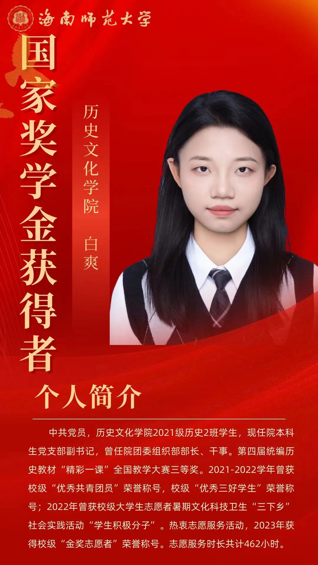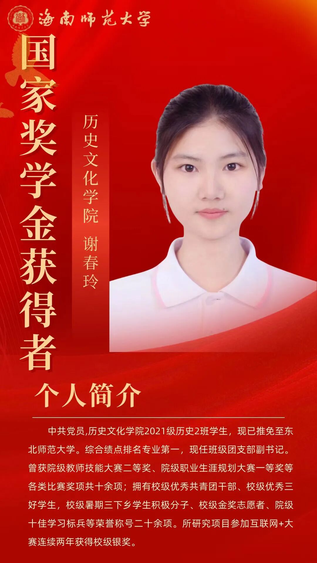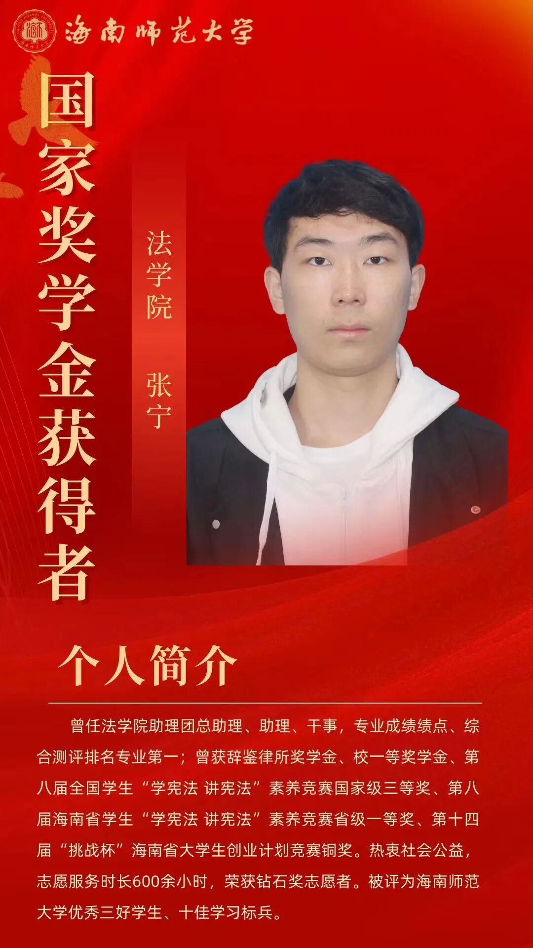在逐梦的青春征途上,榜样的力量总是熠熠生辉,为我们照亮前行的道路。“海师微学工”微信公众号特别制作《国奖人物》专栏,通过展现2023-2024年度国家奖学金获得者的风貌,激励学子们锚定逐梦航向,扬起青春之帆。