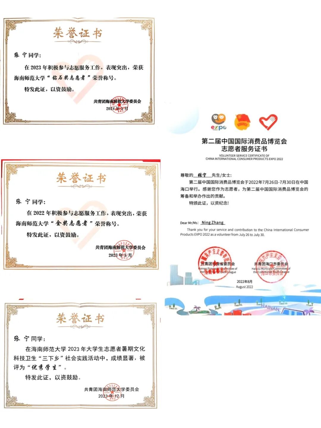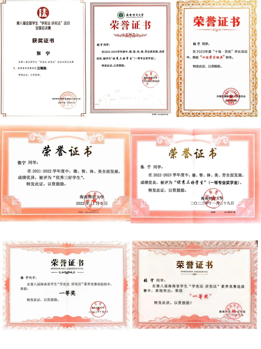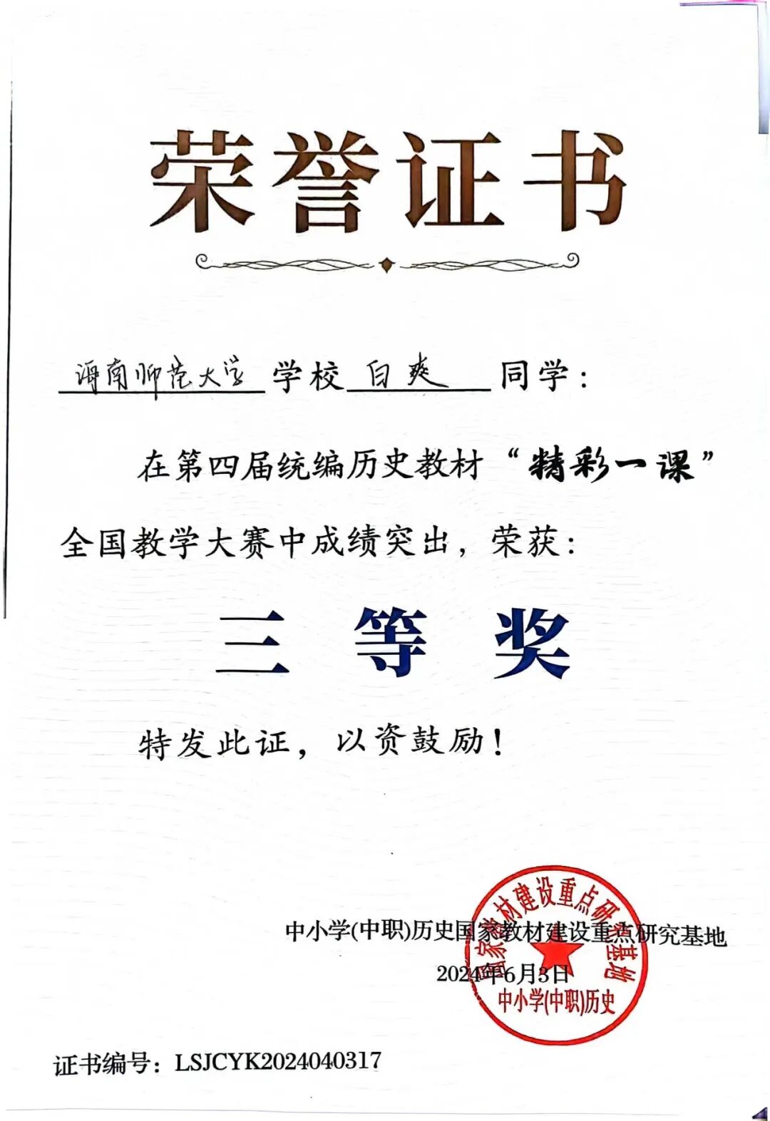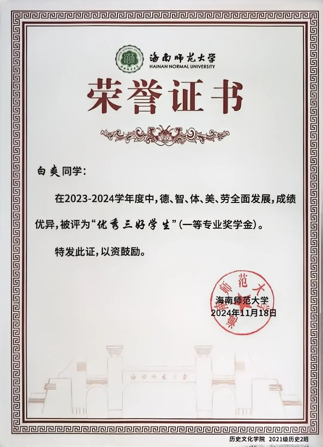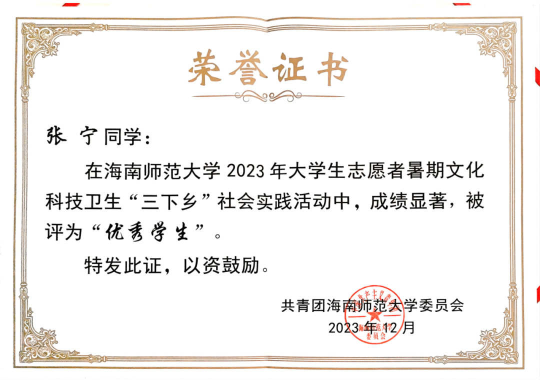 个人事迹 含章可贞,明辨笃行。大学所修课程平均学分绩点为3.93,是她认真投身于本专业知识学习的成果,在大学的学习过程中,她系统学习了《世界古代史》、《中国古代史》、《中国近代史》、《中外关系史》等课程,平均成绩85分以上。深谙师范专业学习与日积月累的重要性的她,在课余时间认真阅读专业书籍,学习专业知识并不断参与师范生实践和社会实践,提升作为一名师范生的综合素质。在此前夯实基础与扎实学习的基础上,获得了多项校级、省级和国家级学科竞赛荣誉,2024年6月,她代表学校参加了第四届全国统编历史教材“精彩一课”比赛,获得了国家级三等奖。今年9月,参与由权威网站“中学历史园地”举办的第十五届园地杯初中组课件大赛,所参赛的三个课件均获得一等奖。此外,她还通过了普通话等级考试(二甲)、教师资格证笔试和面试(高中语文)。 凭借自身努力,大学三学年里,她获得多项校级荣誉,曾获2021年度校级“优秀共青团员”、2022年度校级“优秀共青团干部”。连续两年获校级一等奖学金,被评为“优秀三好学生”、2022-2023年度院级“十佳学生干部”、院级“优秀学生干部”。她不忘积极参加各类活动,在第九届中国国际“互联网+”大学生创新创业大赛校级赛中荣获银奖、院级第四届教师技能大赛荣获一等奖并作为团队成员获校级第十三届大学生教师技能大赛文科组团体总分二等奖;在连续两年里,她获校级暑期“三下乡”积极分子称号、校级“银奖志愿者”荣誉称号。 白爽相关获奖证书 闳中肆外,观澜索源。在不断学习进取的道路上,她深知科研的重要性,参与“探寻红色文化,传承革命精神——以海南乐东黎族自治县为例”调研团,并撰写相关调研报告,获校级优秀调查报告(论文)三等奖。在科研中,她注重综合能力的培养,在专业老师的指导下,作为项目参与者,同负责人一起组织开展本次调查,在团队中发挥了分工协作作用,并负责该项目的前期准备、中期访谈调查、后期数据整理分析等任务,在调研中收获了许多。 在社会实践方面,她一直热心于公益,积极参与各类公益志愿活动。自2021年9月入校加入校院两级青年志愿者协会后,她作为一名志愿工作者,在近三年间积极参加校方和学院组织举办的各类志愿公益活动,连续两年参与“三下乡”志愿服务活动,担任历史课程系列教师,用视频引入教学,让学生初步了解历史中的兵器种类,并且采用文物自我介绍的方式向学生展示马式军鼓的基本信息。在节假日期间,她前往海南省博物馆,主要负责2楼展厅海南历史文化的介绍,进行志愿讲解服务,既服务了他人,又夯实了自己的历史学基础。 白爽讲课比赛照片 经史为楫,志愿作帆。在本科期间,她曾担任院团委组织部干事、部长,院学生自我管理委员会主任,协助老师负责学院日常团务工作,进行宿舍查寝工作,搭建起老师与学生间的桥梁。作为现任院本科生党支部副书记,她协助支部书记开展支部党员大会,积极开展党支部的日常工作。身为一名中国共产党员,她深知要用党员的标准严格要求自己,同时做好道德模范榜样。 目前,她已成功推免至西南大学学科教学(历史)专业,明年九月将前往西南大学继续攻读研究生学位。基于她对历史学(师范)专业的热爱与向往,她渴望能够继续深入自己热爱的领域进行学习与研究。“为教育事业奋斗终生”是她的人生所求,在未来的人生规划里,她希望能将所学化为所用,在专业上更加精进自己的造诣。 白爽个人生活照 白爽和朋友合照 个人事迹 筚路蓝缕,玉汝于成。每每回望自己的来时路,她一直都觉得自己是一个幸运的孩子,虽然从小作为留守儿童在爷爷奶奶的照顾下长大,但这样的成长环境更造就了她独立的性格。家庭是她不断向前的重要动力来源,好朋友们亦始终在她身边。 自大学入学以来,她始终以勤恳认真的态度对待每一项练习、任务、实践和工作,换来的是老师们和同学们的信任与理解。在学习和成长阶段,即使遇到过不少困难,经历了不少挫折,谢春玲一直以勤奋乐观、积极向上的精神状态努力拼搏,做好计划,脚踏实地地一步步向前,以严谨负责、求真务实的标准要求自己。 谢春玲相关获奖证书 木铎金声,志愿长明。在本科生涯里,谢春玲积极地参与志愿服务活动,班级青协队长的职务让她对志愿者工作的认识不断深入,更让她把奉献、友爱、互助、进步的志愿者精神牢记在心。在研究与学习上,她参与小组主题为《非遗传承之木偶戏焕新》的研究项目,从项目立项到上交,每一个步骤,她都和小组成员们踏踏实实地干,不懂就问,不会就学,从不断修改方法,查找问题,到不断推翻重建,把问题掰开了、揉碎了研究,最后一步步找到问题的解决方法。让她坚持下来的动力,是成就感的驱动,更是老师们的关怀和团队成员之间相互勉励的温暖。这样的经历,让她对科研有了更新更全面的认识,也让自身的个人素质得到了极大的提升。 在大学期间,她积极向党组织靠拢,努力提高自己,积极帮助他人,严格以党员标准要求自己,不断追求进步。2023年12月10日,经过党组织的考察,谢春玲成为了一名光荣的中国共产党党员。在成为党员之后,她仍然保持着优良的作风,以党员的行为准则要求自己,在学习和贡献的道路上不断前进。 谢春玲三下乡照片 知行合璧,德业双修。自大一第一学期开始,每一节课她