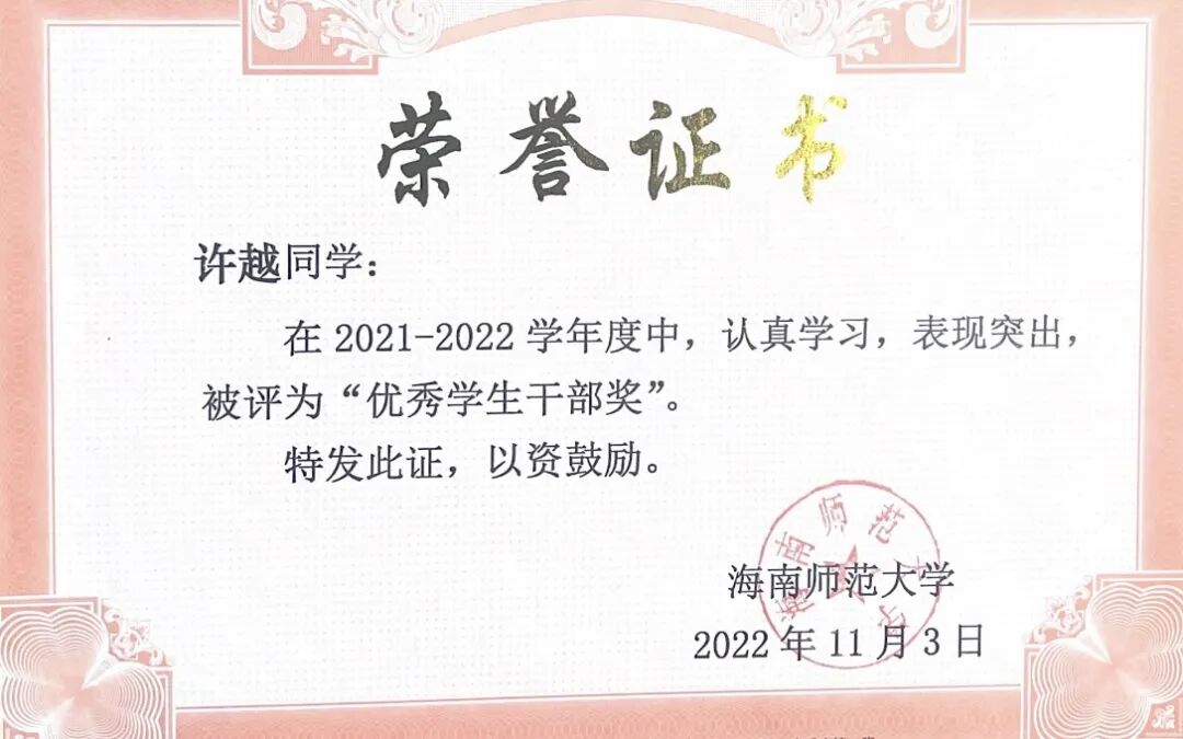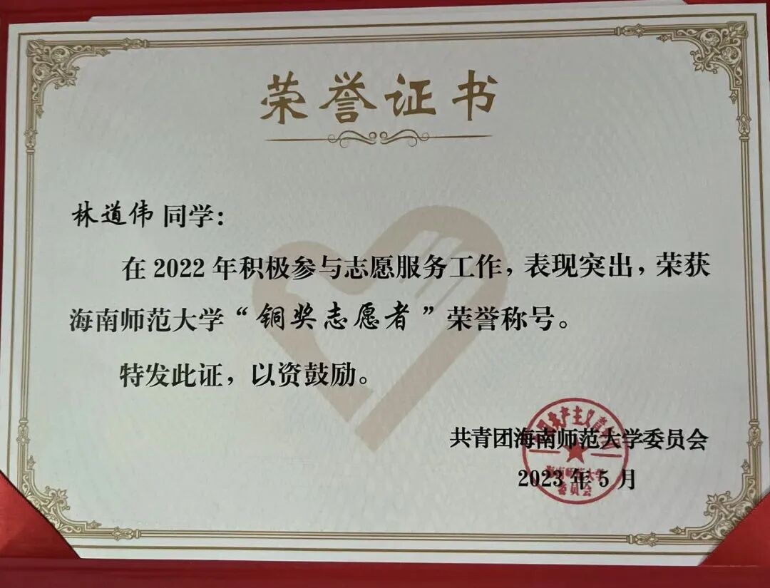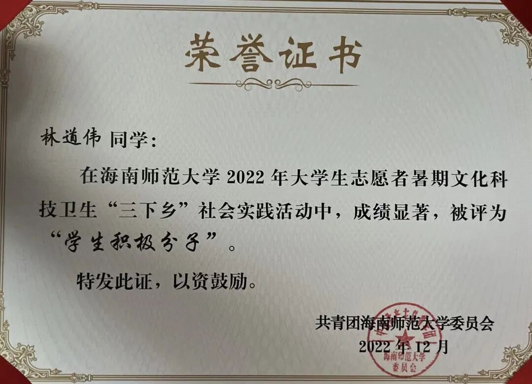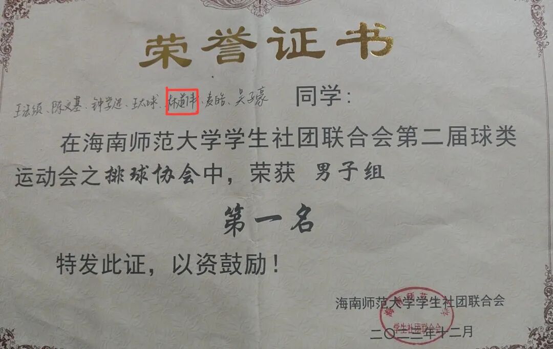 在校期间参加各类活动,排球赛,运动会等,他曾获得“校级社会实践积极分子”的荣誉称号,连续三年参与“三下乡”社会实践活动,帮助偏远地区的孩子补习知识,与此同时他也荣获“三下乡学生积极分子”称号;他还参与了“海南师范大学第二次党代会”负责第七分会场的场务活动,并负责2022年与2023年的新生接待活动。