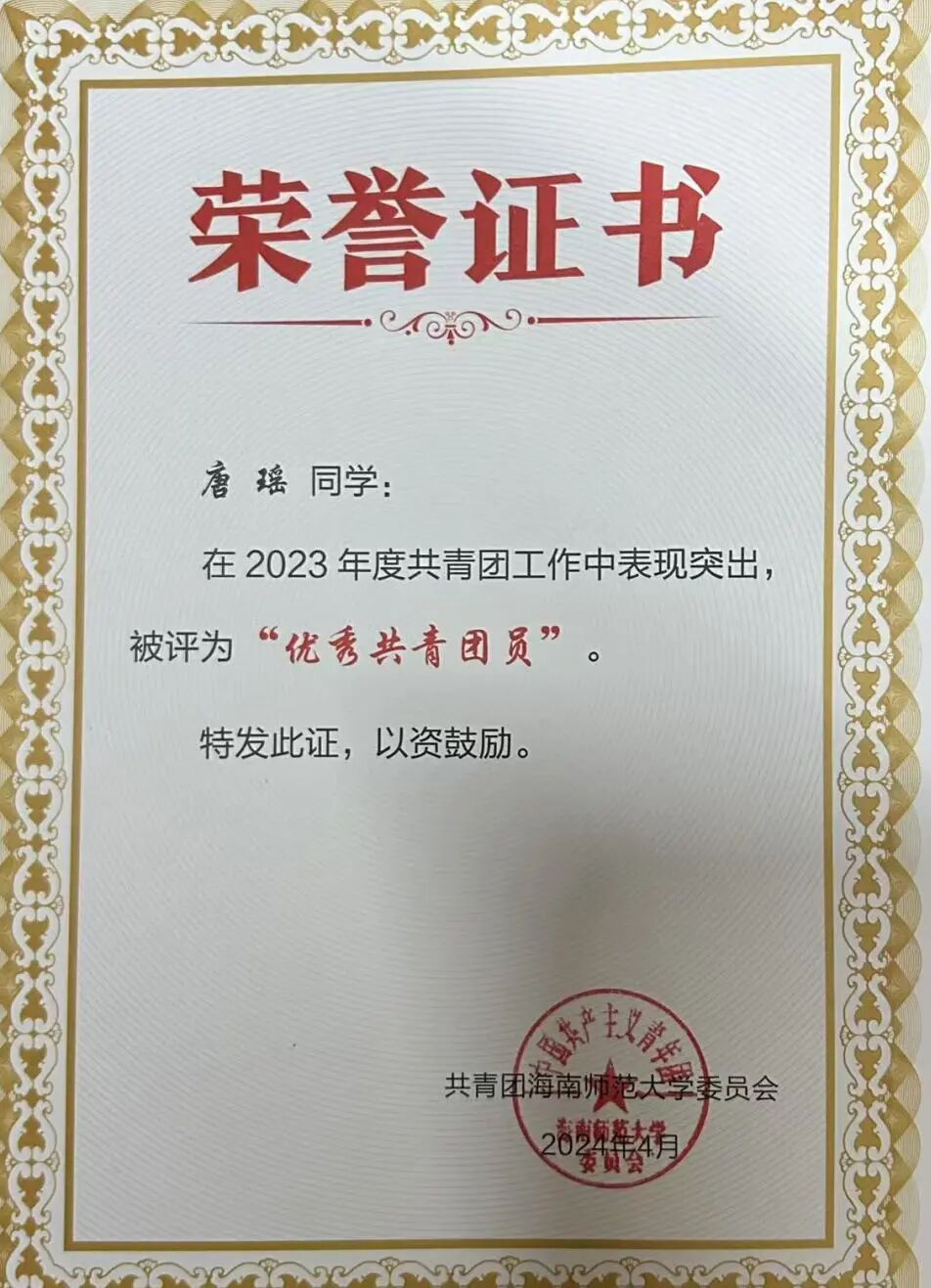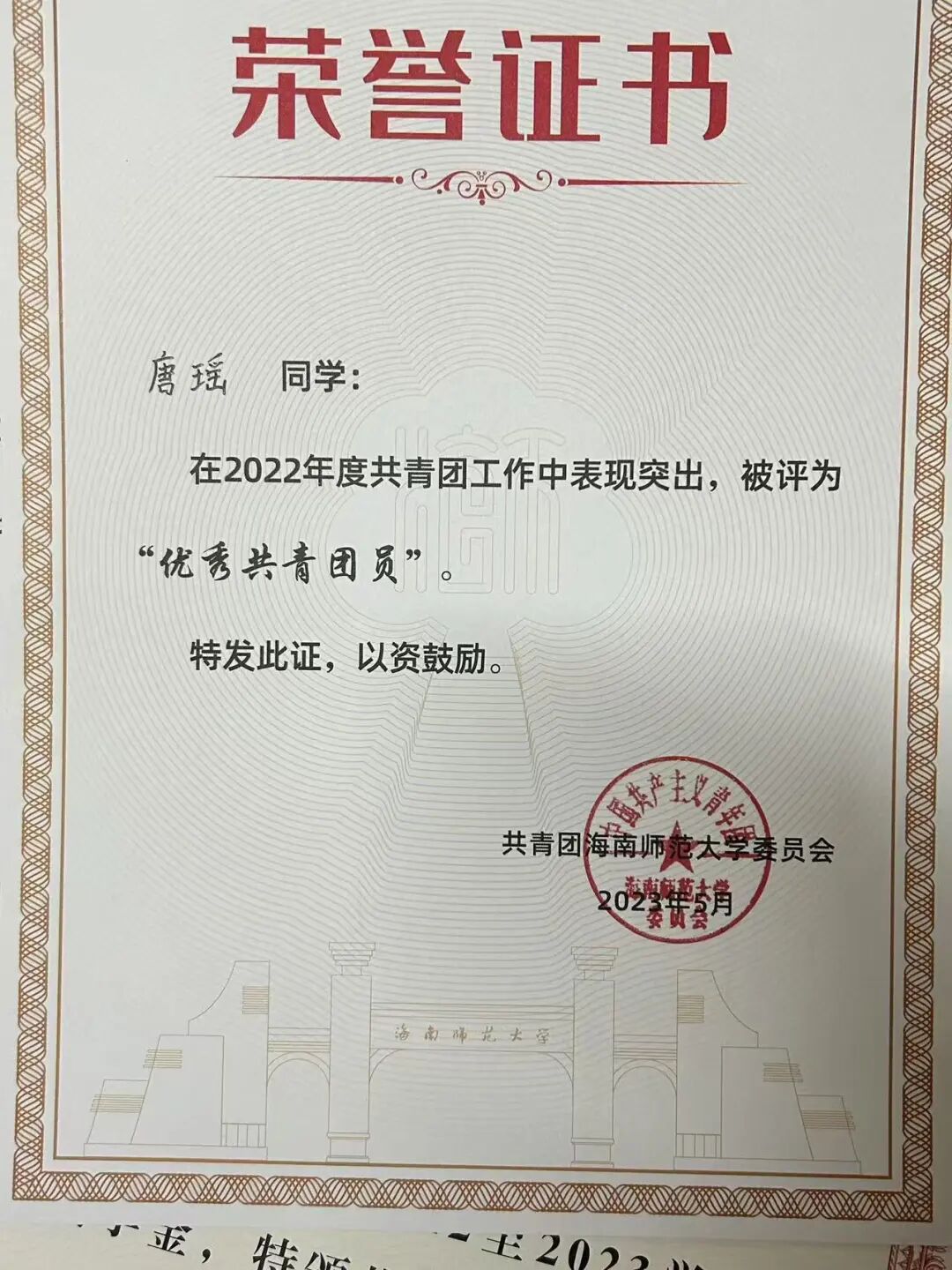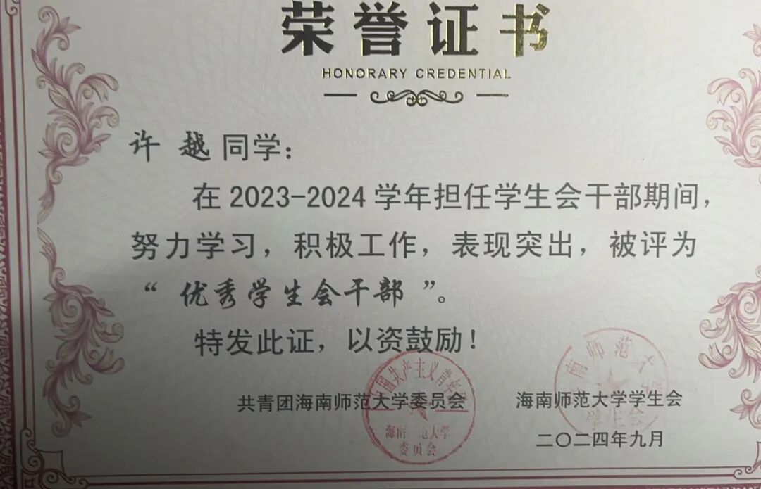 在校期间参加各类活动,排球赛,运动会等,他曾获得“校级社会实践积极分子”的荣誉称号,连续三年参与“三下乡”社会实践活动,帮助偏远地区的孩子补习知识,与此同时他也荣获“三下乡学生积极分子”称号;他还参与了“海南师范大学第二次党代会”负责第七分会场的场务活动,并负责2022年与2023年的新生接待活动。