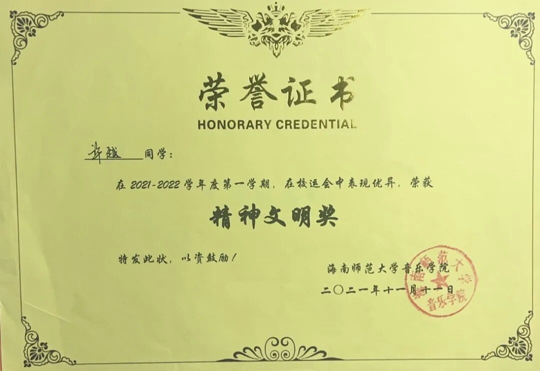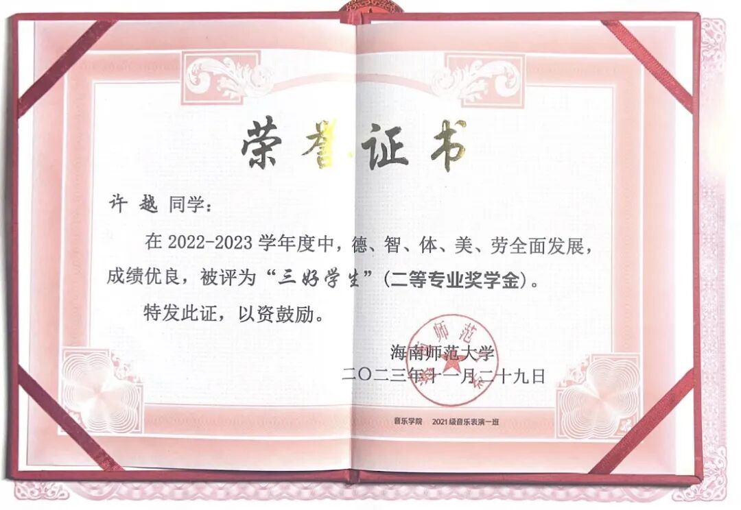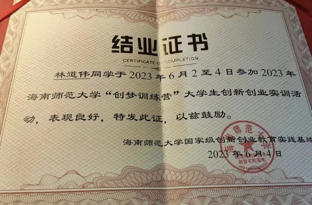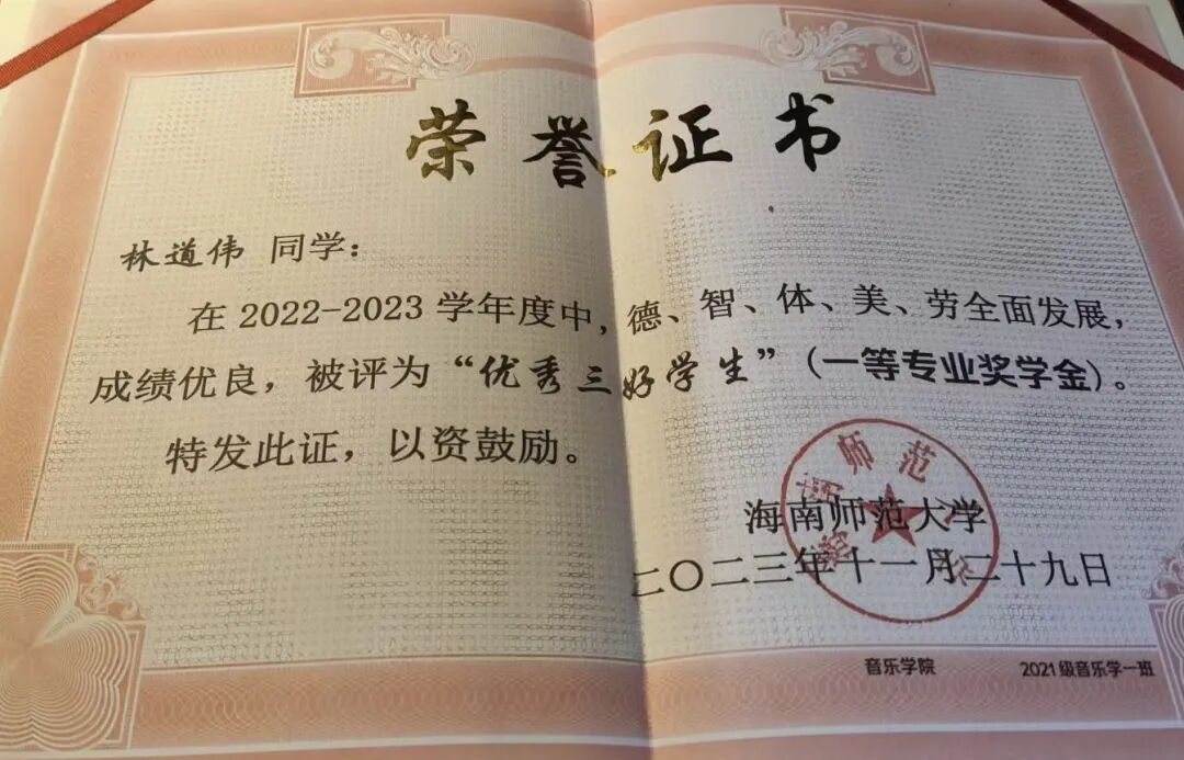 他深刻的意识到不论任何领域,拥有扎实的专业知识才是最为重要的,所以积极学习各种文化知识,并考取二级甲等普通话、高中音乐教师资格证、英语四级、二级计算机、三级互联网营销师等资格证书,并参加“海南师范大学创梦训练营”顺利结业。