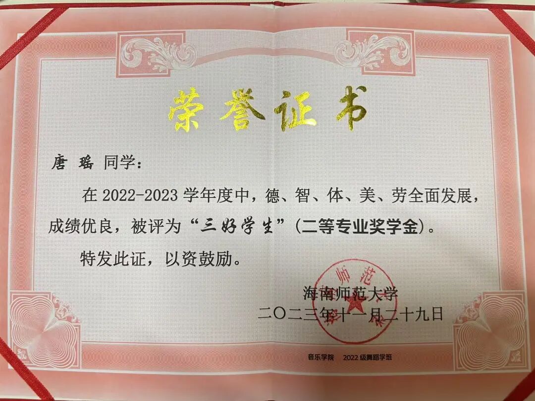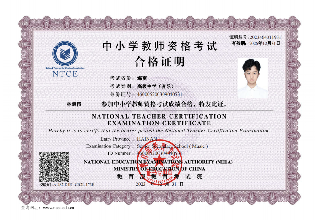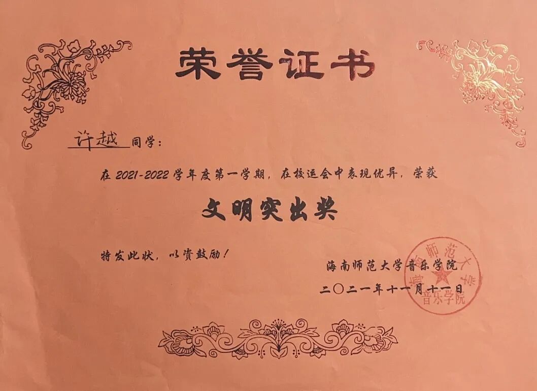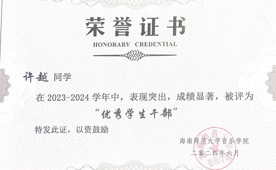 他深刻的意识到不论任何领域,拥有扎实的专业知识才是最为重要的,所以积极学习各种文化知识,并考取二级甲等普通话、高中音乐教师资格证、英语四级、二级计算机、三级互联网营销师等资格证书,并参加“海南师范大学创梦训练营”顺利结业。
