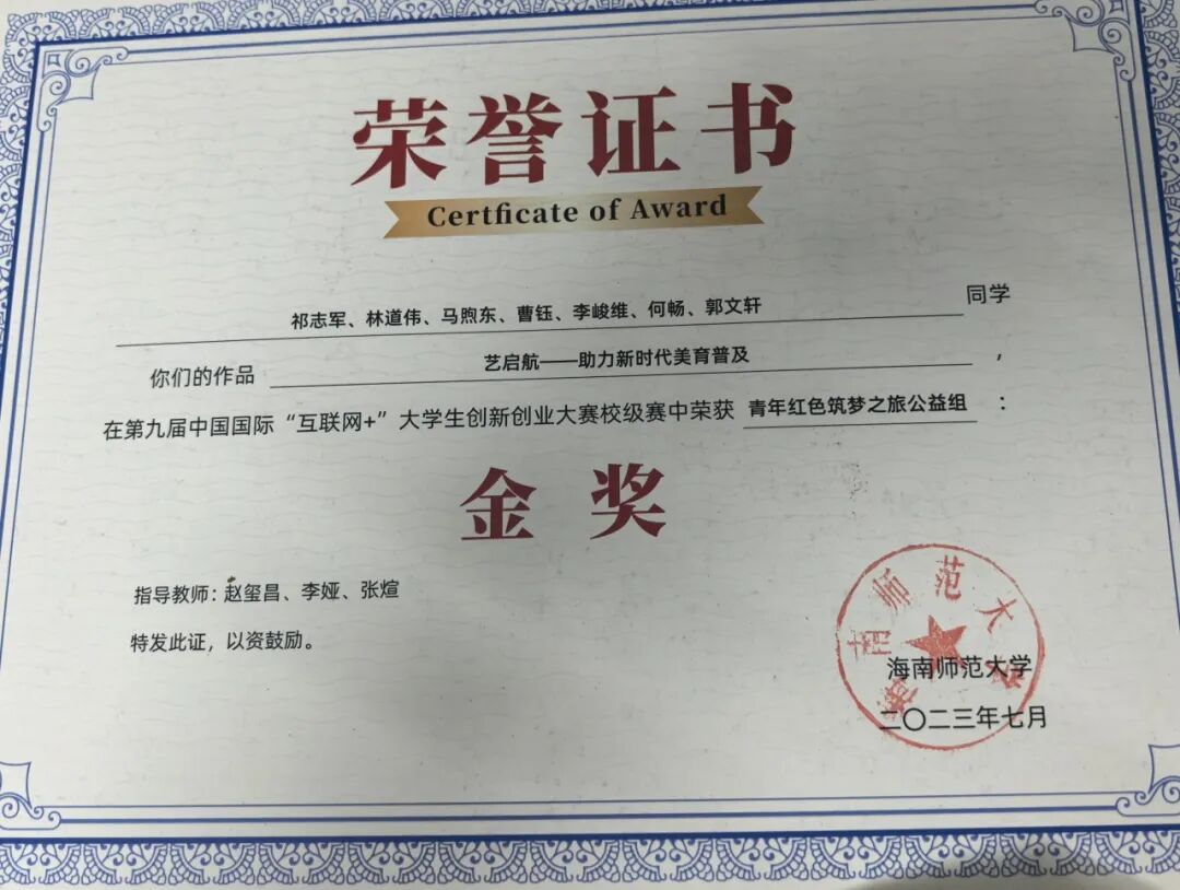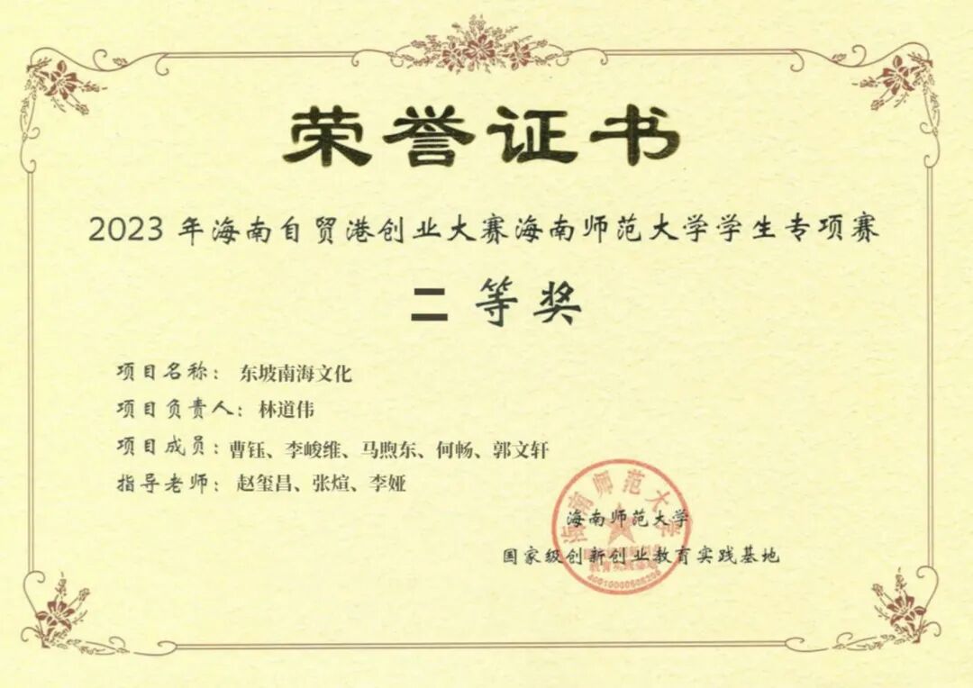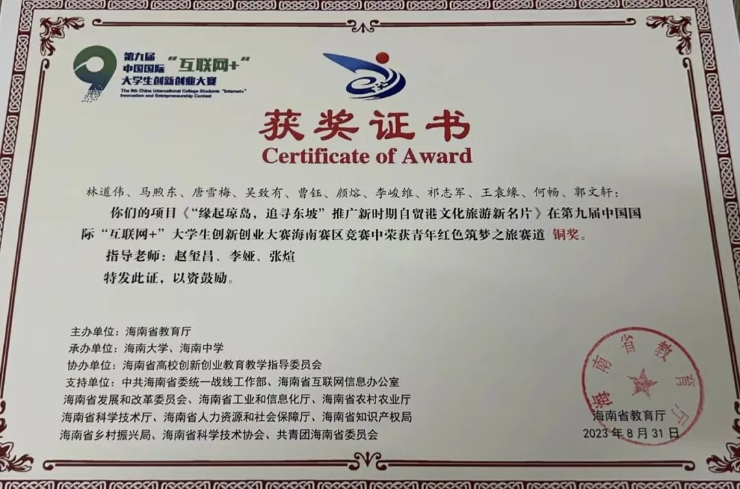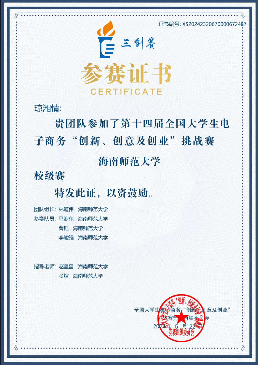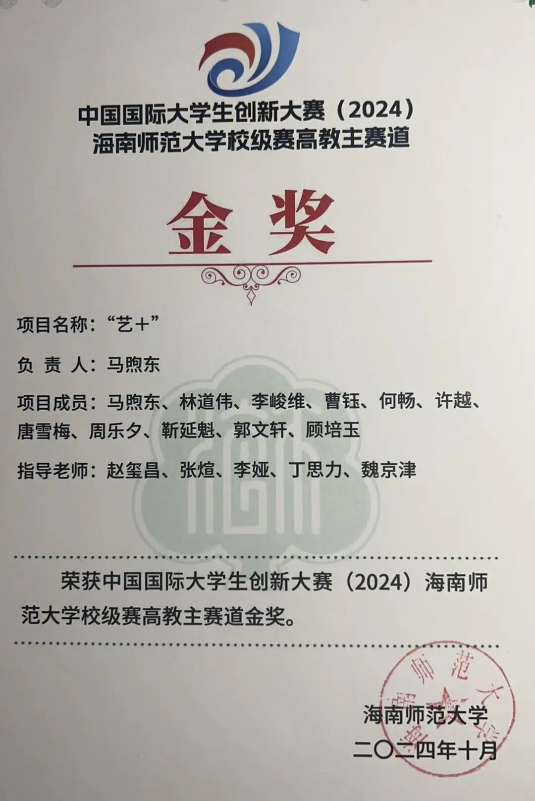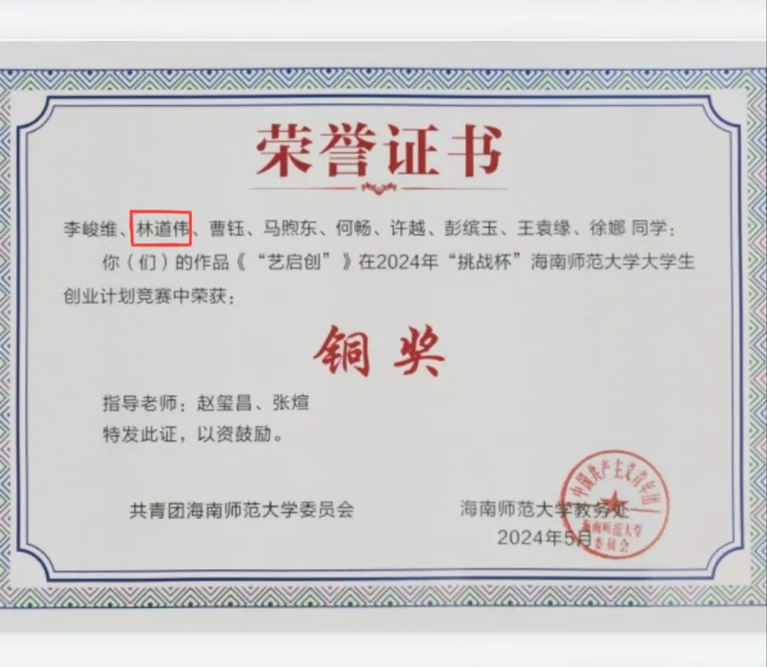过往之勉,未来之期。在校期间,他发起并主导了创新创业项目:2024年中国国际大学生创新大赛“艺+”荣获国家级铜奖、大学生挑战杯校级一等奖、第九届全国互联网+大赛中的“缘起琼岛,追寻东坡”的项目荣获省级铜奖、互联网+“艺启航”项目荣获校级金奖、“创新创业孵化基地”项目荣获校级金奖、“东坡南海文化”荣获2023年海南省自贸港创业大赛专项赛“二等奖、的成绩、“海南师范大学大学生创新创业荣获省级奖项”等等这些创新创业的经历,这不仅锻炼了他的实践能力,同时也让他更加理解了创新创业的内涵。