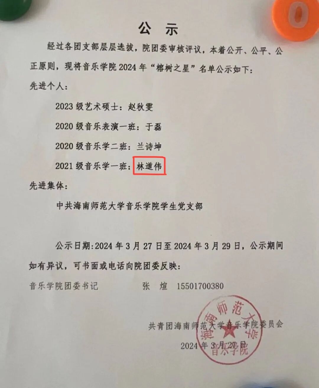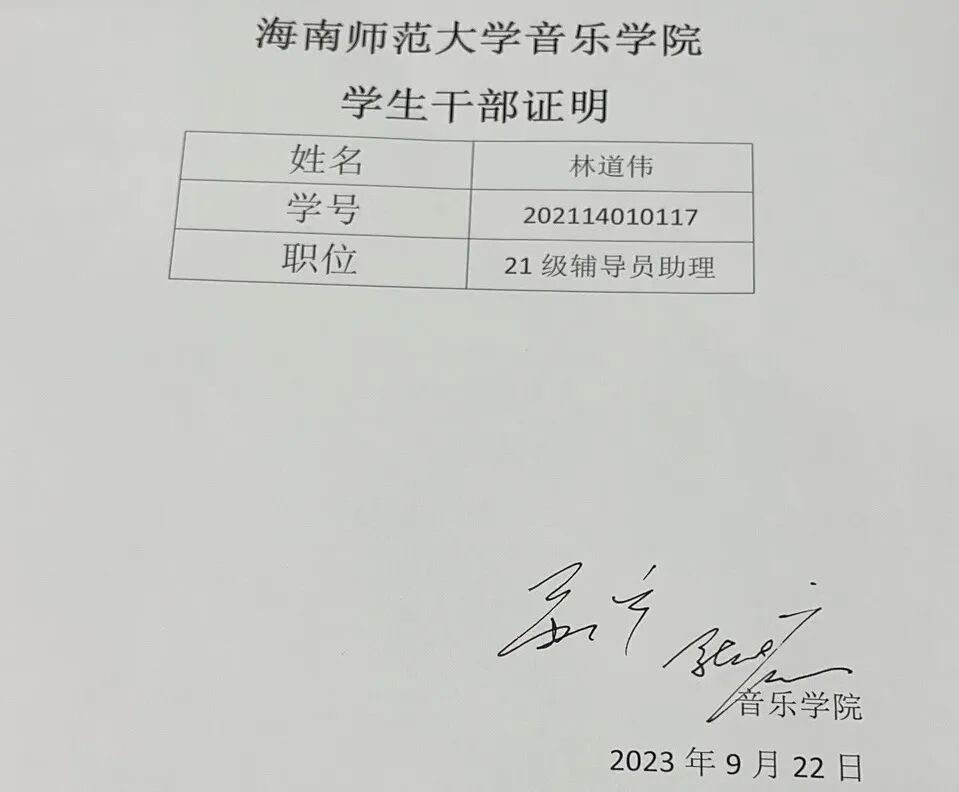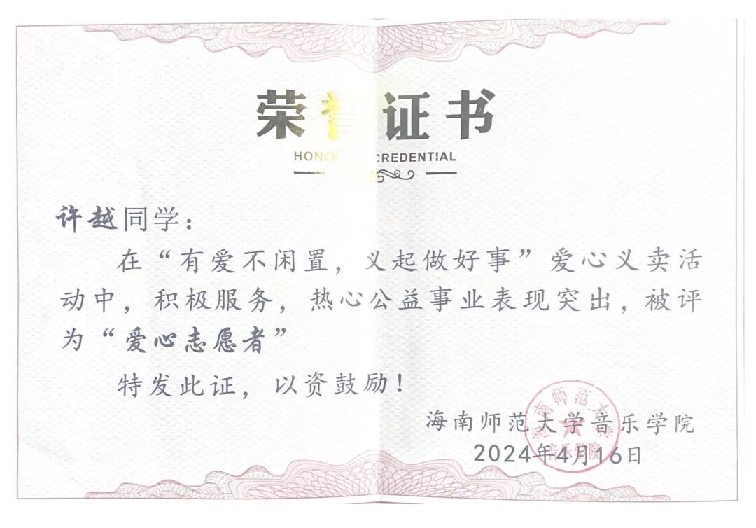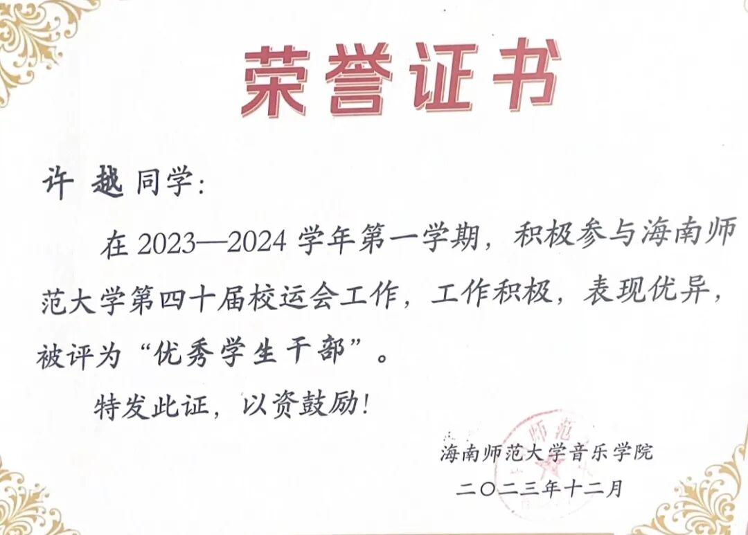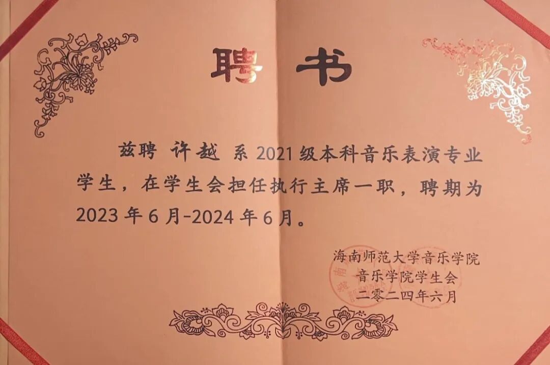 音为爱行,志愿初心。艺术实践是提升音乐技艺的重要途径。从进入大学后,他积极参加志愿活动,参加过的大型志愿活动累计50多次,时长达300小时。从入学以来担任2021级辅导员助理、海南师范大学纪检监委宣传员、校社联篮球协会财务部部长。组织并参与海南师范大学新年音乐会,以及学院的各种晚会中的音响和灯光,为学院大大小小的晚会设计灯光与音响设备。此外,他还参加过中国国际消费品博览会、中国民族运动会等大型志愿服务,荣获消博会“优秀志愿者”称号、“金、银、铜奖志愿者”称号。
