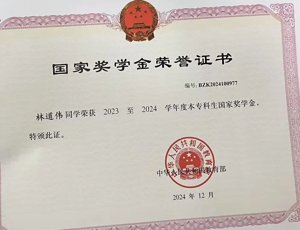 乐赛征程,勤书韶华。音乐之路离不开坚实的学术基础,他始终保持对音乐的热爱和对知识的渴望。投入了大量的时间和精力去学习和研究。连续两年以全院综测排名第一的成绩荣获国家励志奖学金、国家奖学金、两年校级一等奖学金、两年优秀三好学生、获得“校级十佳文体标兵”、“院级创新创业标兵”、“院级榕树之星”等荣誉称号,这为他的音乐之路奠定了坚实的基础。