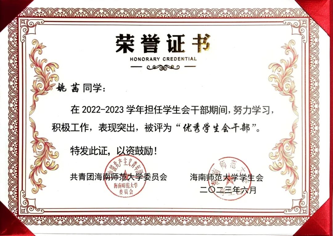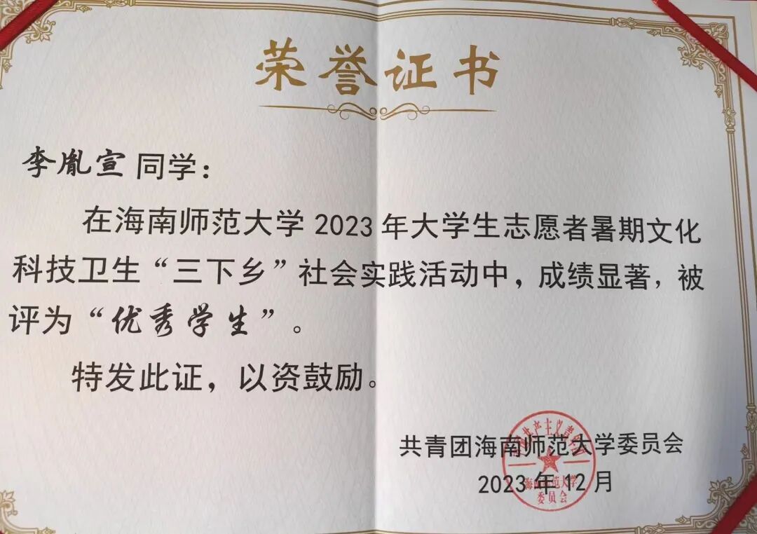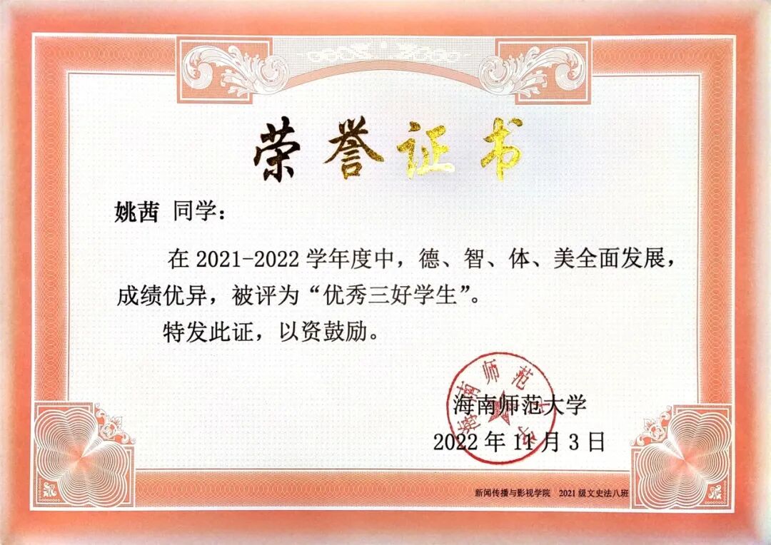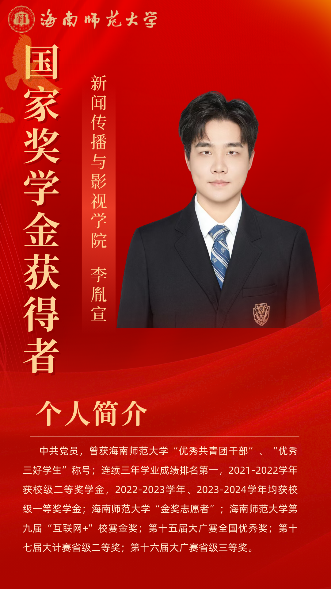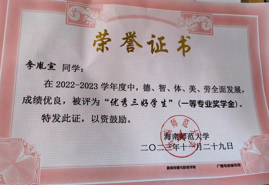 新闻传播与影视学院 个人事迹青年之声,用心传递。理论宣讲不是照本宣科,而是要用年轻人听得懂的语言,让真理直抵人心。作为榕树青年宣讲团的主力队员,李欣柔走出校园,追寻红色印记,发挥自己的力量努力推动理论宣讲走“青年路”、说“青年话”、有“青年味”。在疍家渔排上聊乡村文化振兴;在海南“最美书屋”里畅谈“终身学习”;在琼中红军小学与孩子们共话红色传承…她参与了主题宣讲教育20余场,囊括5个市县,覆盖人数800人次,她擅于用生动的案例、真挚的情感,将晦涩难懂的理论知识转化为更加生动活泼的表述,有力地推动党的理论在青年群体中落地生根,不断激励青年踔厉奋发。 以知促行,以行求知。在学业上,李欣柔坚持以 “求学者” 的姿态深耕专业。她综测稳居前三,获得校一等奖学金、二等奖学金、“优秀三好学生” 等荣誉,这些奖状离不开她的勤奋和执着。但她并未止步于此,而是将知识融入实践,用专业知识在不同领域发光发热。她主持过海南省大学生职业生涯规划大赛启动仪式、高雅艺术进校园等30余场活动,以新闻主播身份录制海南省残联新闻,拍摄海南师范大学招生宣传片,用镜头记录青春的温度。多面开花,多点结果。她的身影活跃于各类比赛中,海南省大学生艺术展演朗诵类二等奖、“诵读中国” 经典诵读大赛省级一等奖(全国优秀奖)、“互联网 +” 创新创业大赛校级金奖…… 这些荣誉的背后是对“路漫漫其修远兮,吾将上下而求索”的追寻,在不断的自我探索和实现中,她一步步坚定信念、绽放光彩。 热忱奉献,践行责任。志愿服务是青春最亮丽的底色。李欣柔累计志愿服务时长达500小时,从消博会到 “三下乡”,从社区服务到乡村振兴,她的足迹遍布海南大地。在陵水黎族自治县本号镇,她带领实践团开展 “暑期文化科技卫生三下乡” 活动;她走进陵水多所中小学,为百余名中小学生讲授主题团课;她积极调研乡村产业发展,开展支教科普和红色文化教育活动,用知识助力振兴。她用自己的专业知识和乐于奉献的态度,积极履行服务社会的责任。 李欣柔始终以 “热爱” 诠释初心,用 “奋斗” 书写青春。她是理论宣讲的 “轻骑兵”,是知识创新的 “追梦人”,是志愿服务的 “践行者”,更是乡村振兴的 “书写者”。她始终保持着“平和而执着,谦虚而无畏”的心态,沿着党开辟的道路,在传媒事业中鼓舞斗志,在追梦圆梦中砥砺前行! 亲爱的小海狮,别让“标准答案”困住你的想象,舞台或许有边界,但热爱与坚持能让它无限延伸——无论是用台词传递思想的重量,用镜头定格时代的温度,还是在乡野间以实践书写青春的意义,别怕尝试,别吝真诚,那些看似孤独的练习、深夜的创作、田野里的奔走,终会沉淀成你独有的光芒。以“崇德尚学”为底色,在专业中深耕细作;以“求是创新”为笔墨,在创新中突破桎梏。 去倾听、去表达、去行动,在每一次“不可能”中种下可能,成为自己故事里最动人的主角。 个人事迹 以学为舟,遨游知识海洋。初入大学的李胤宣,将 “做更好的自己”作为人生信条。课堂上,他总是坐在第一排,专注的目光紧追着老师,不论是专业课程,还是通识课程,他都努力朝着更高的成绩去争取。当发现体育成绩成为短板时,他没有选择退缩,而是在寒假每天坚持与同学打球,并且在第二学期主动向体育老师请教。这份执着与坚持,让他最终如愿以偿地补足了自己的短板,收获了更好的自己。 在专业学习之外,李胤宣也始终保持着对知识的渴求。他先后通过英语四六级和高中历史教资考试,在郴州电视台、海南省电视台的实践经历更让他积累了丰富的新闻采编经验。学科竞赛的舞台上,他与团队成员并肩作战,从海南师范大学第九届 “互联网 +” 校赛金奖到大广赛全国优秀奖,每一份荣誉背后都是无数个日夜的头脑风暴与反复打磨。 以德为舵,坚守精神航向。人生的道路上,可以没有辉煌的结果,但不能没有闪耀的过程。大一入学时,李胤宣早早明确了要加入中国共产党的目标,递交了入党申请书。他始终以一名优秀党员的标准要求自己,时刻关注国家的最新变动情况,了解学习党的路线、方针和政策,并积极参加学院组织的团学干部培训。功夫不负有心人,他在大二被评为入党积极分子,并成功在大三下学期成为了一名光荣的中共党员。 从晨光熹微的课堂到灯火通明的办公室,从竞技赛场的拼搏到志愿服务的温情,他用脚步丈量着青春的广度,以实践书写着新时代追梦人的方向。那些印刻在时光里的奖状与证书,不仅是对过往的褒奖,更是新征程的起点。 以责为帆,勇担青春使命。学生工作的历练,让李胤宣深刻理解了责任的重量。从院团委干事到青协部长,再到学生会主席,他始终秉持着 “争做学生友,不当学生官”的准则。担任青协部长期间,他策划组织的 “美化校园”“学雷锋,慰老人”等志愿活动,激励着青春在奉献中闪光;作为学生会主席,他将活动策划经验倾囊相授,用真诚与智慧凝聚起团队力量。在班级工作中,李胤宣连续三年担任团支书,用耐心与热情服务每一位同学。 当看到班级在他的带领下凝聚力不断增强,当听到同学们对他工作的认可,内心的骄傲油然而生,他深知,学生干部的责任不是权力,而是用真心换得成长的勋章。 学长寄语 吃别人所不能吃的苦,忍别人所不能忍的气,做别人所不能做