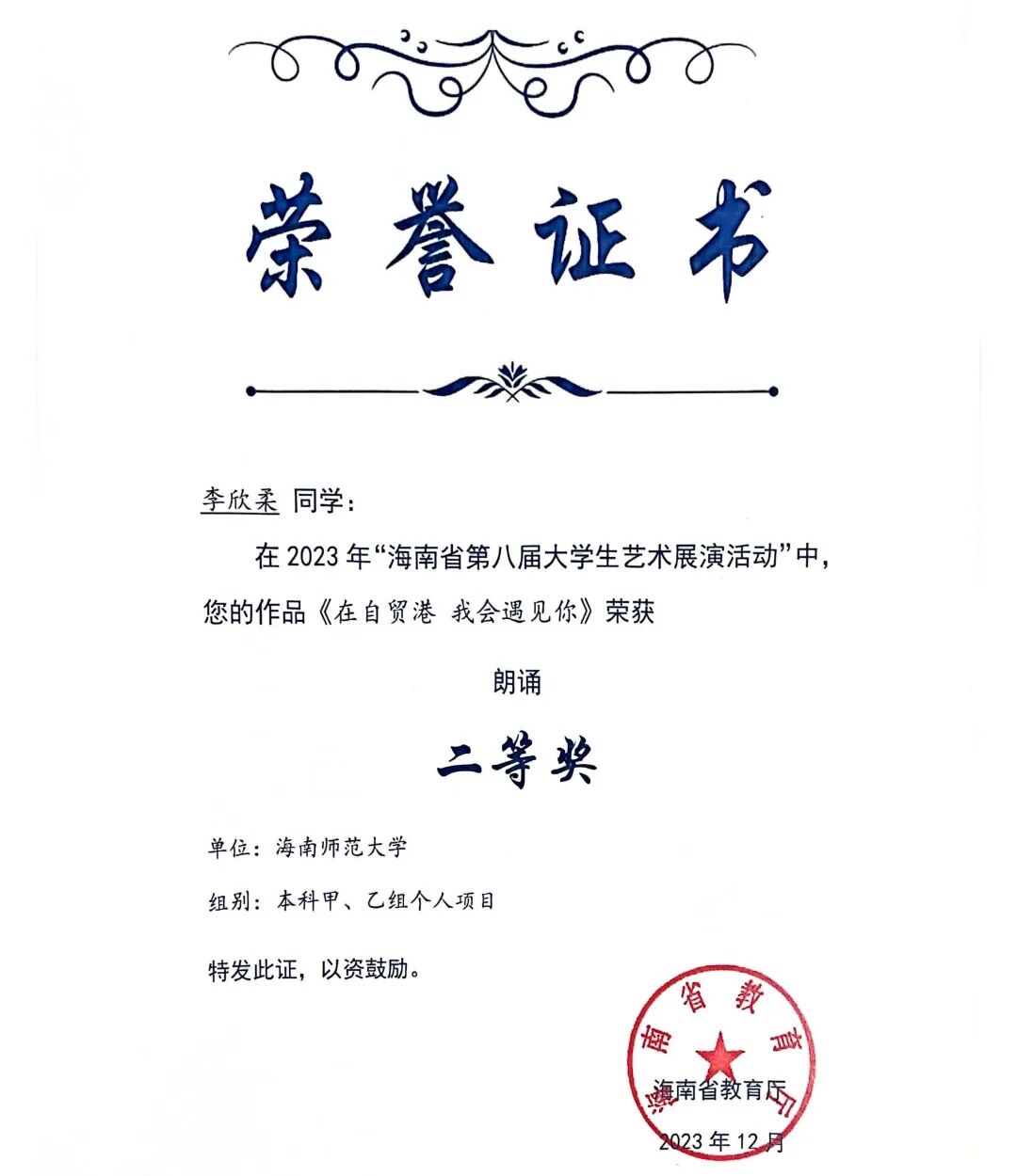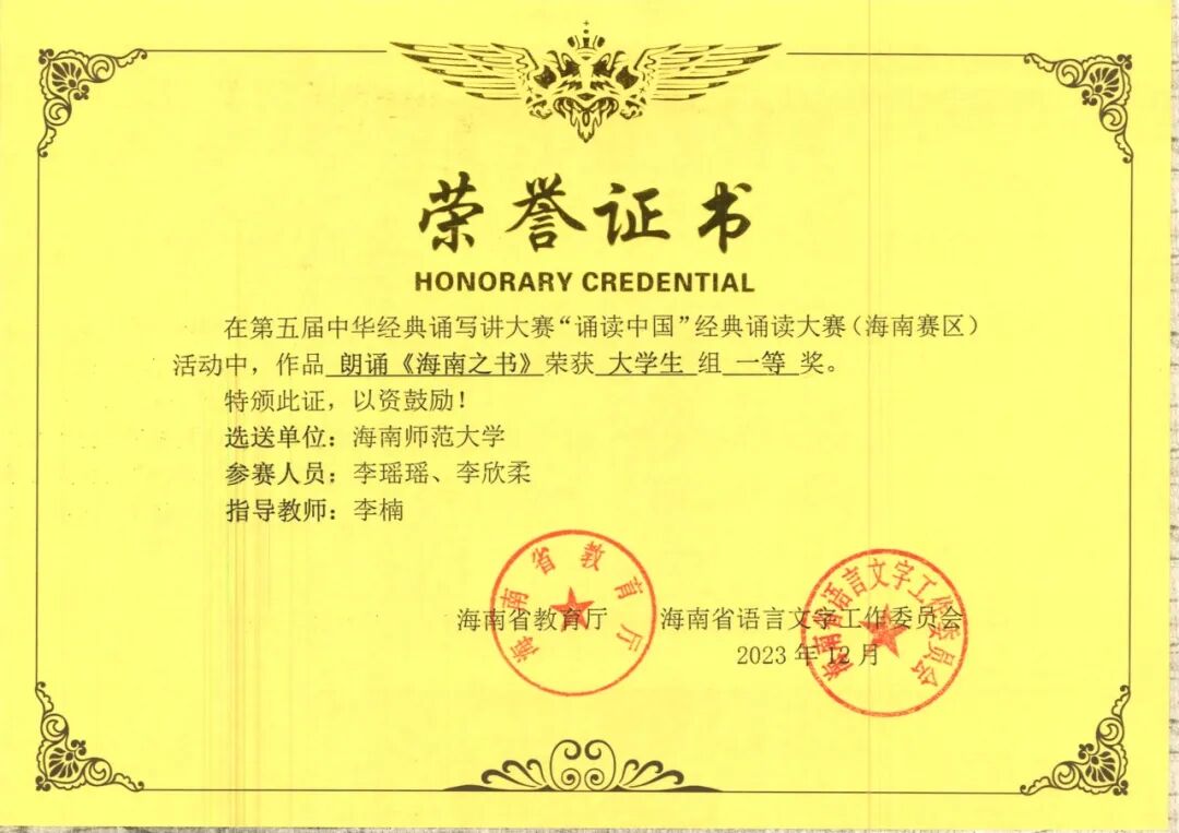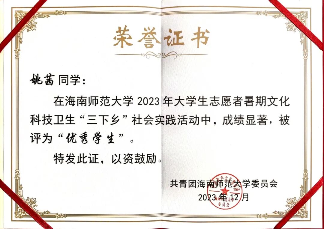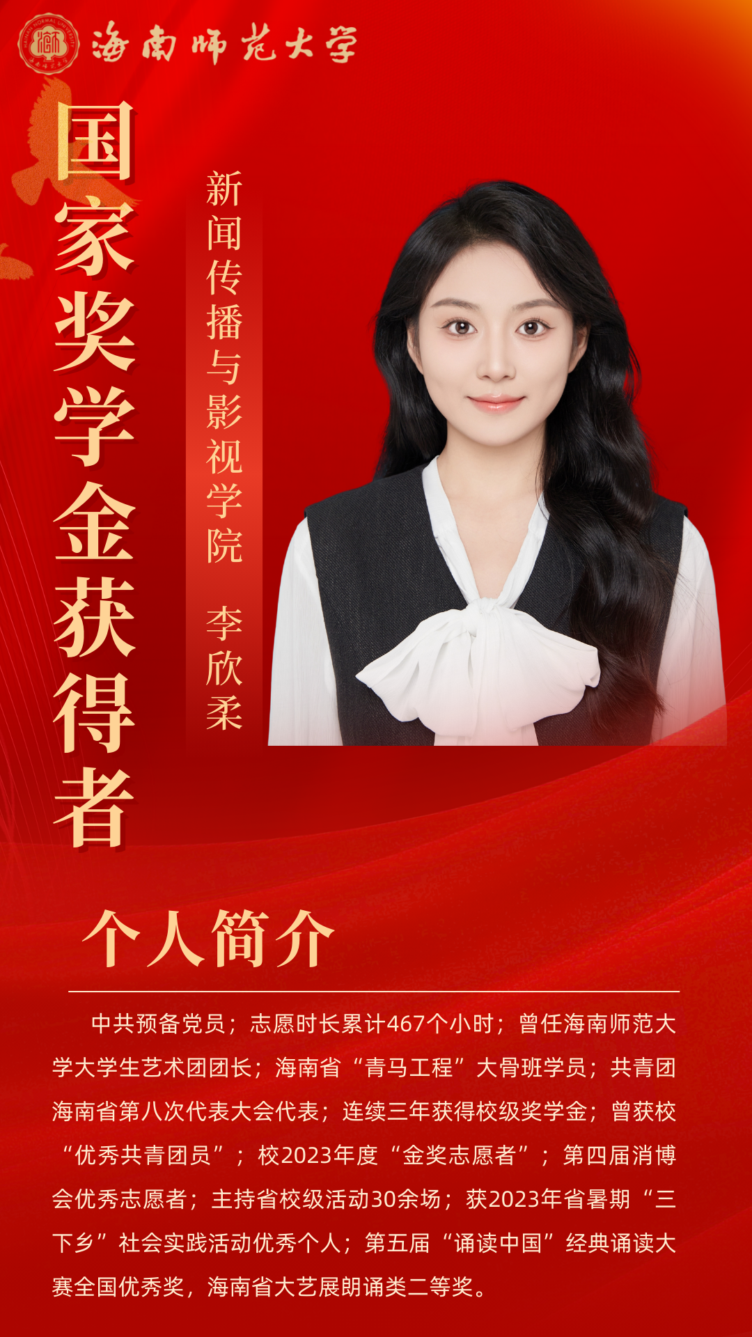 新闻传播与影视学院 个人事迹青年之声,用心传递。理论宣讲不是照本宣科,而是要用年轻人听得懂的语言,让真理直抵人心。作为榕树青年宣讲团的主力队员,李欣柔走出校园,追寻红色印记,发挥自己的力量努力推动理论宣讲走“青年路”、说“青年话”、有“青年味”。在疍家渔排上聊乡村文化振兴;在海南“最美书屋”里畅谈“终身学习”;在琼中红军小学与孩子们共话红色传承…她参与了主题宣讲教育20余场,囊括5个市县,覆盖人数800人次,她擅于用生动的案例、真挚的情感,将晦涩难懂的理论知识转化为更加生动活泼的表述,有力地推动党的理论在青年群体中落地生根,不断激励青年踔厉奋发。 以知促行,以行求知。在学业上,李欣柔坚持以 “求学者” 的姿态深耕专业。她综测稳居前三,获得校一等奖学金、二等奖学金、“优秀三好学生” 等荣誉,这些奖状离不开她的勤奋和执着。但她并未止步于此,而是将知识融入实践,用专业知识在不同领域发光发热。她主持过海南省大学生职业生涯规划大赛启动仪式、高雅艺术进校园等30余场活动,以新闻主播身份录制海南省残联新闻,拍摄海南师范大学招生宣传片,用镜头记录青春的温度。多面开花,多点结果。她的身影活跃于各类比赛中,海南省大学生艺术展演朗诵类二等奖、“诵读中国” 经典诵读大赛省级一等奖(全国优秀奖)、“互联网 +” 创新创业大赛校级金奖…… 这些荣誉的背后是对“路漫漫其修远兮,吾将上下而求索”的追寻,在不断的自我探索和实现中,她一步步坚定信念、绽放光彩。 热忱奉献,践行责任。志愿服务是青春最亮丽的底色。李欣柔累计志愿服务时长达500小时,从消博会到 “三下乡”,从社区服务到乡村振兴,她的足迹遍布海南大地。在陵水黎族自治县本号镇,她带领实践团开展 “暑期文化科技卫生三下乡” 活动;她走进陵水多所中小学,为百余名中小学生讲授主题团课;她积极调研乡村产业发展,开展支教科普和红色文化教育活动,用知识助力振兴。她用自己的专业知识和乐于奉献的态度,积极履行服务社会的责任。 李欣柔始终以 “热爱” 诠释初心,用 “奋斗” 书写青春。她是理论宣讲的 “轻骑兵”,是知识创新的 “追梦人”,是志愿服务的 “践行者”,更是乡村振兴的 “书写者”。她始终保持着“平和而执着,谦虚而无畏”的心态,沿着党开辟的道路,在传媒事业中鼓舞斗志,在追梦圆梦中砥砺前行! 亲爱的小海狮,别让“标准答案”困住你的想象,舞台或许有边界,但热爱与坚持能让它无限延伸——无论是用台词传递思想的重量,用镜头定格时代的温度,还是在乡野间以实践书写青春的意义,别怕尝试,别吝真诚,那些看似孤独的练习、深夜的创作、田野里的奔走,终会沉淀成你独有的光芒。以“崇德尚学”为底色,在专业中深耕细作;以“求是创新”为笔墨,在创新中突破桎梏。 去倾听、去表达、去行动,在每一次“不可能”中种下可能,成为自己故事里最动人的主角。 个人事迹 以学为舟,遨游知识海洋。初入大学的李胤宣,将 “做更好的自己”作为人生信条。课堂上,他总是坐在第一排,专注的目光紧追着老师,不论是专业课程,还是通识课程,他都努力朝着更高的成绩去争取。当发现体育成绩成为短板时,他没有选择退缩,而是在寒假每天坚持与同学打球,并且在第二学期主动向体育老师请教。这份执着与坚持,让他最终如愿以偿地补足了自己的短板,收获了更好的自己。 在专业学习之外,李胤宣也始终保持着对知识的渴求。他先后通过英语四六级和高中历史教资考试,在郴州电视台、海南省电视台的实践经历更让他积累了丰富的新闻采编经验。学科竞赛的舞台上,他与团队成员并肩作战,从海南师范大学第九届 “互联网 +” 校赛金奖到大广赛全国优秀奖,每一份荣誉背后都是无数个日夜的头脑风暴与反复打磨。 以德为舵,坚守精神航向。人生的道路上,可以没有辉煌的结果,但不能没有闪耀的过程。大一入学时,李胤宣早早明确了要加入中国共产党的目标,递交了入党申请书。他始终以一名优秀党员的标准要求自己,时刻关注国家的最新变动情况,了解学习党的路线、方针和政策,并积极参加学院组织的团学干部培训。功夫不负有心人,他在大二被评为入党积极分子,并成功在大三下学期成为了一名光荣的中共党员。 从晨光熹微的课堂到灯火通明的办公室,从竞技赛场的拼搏到志愿服务的温情,他用脚步丈量着青春的广度,以实践书写着新时代追梦人的方向。那些印刻在时光里的奖状与证书,不仅是对过往的褒奖,更是新征程的起点。 以责为帆,勇担青春使命。学生工作的历练,让李胤宣深刻理解了责任的重量。从院团委干事到青协部长,再到学生会主席,他始终秉持着 “争做学生友,不当学生官”的准则。担任青协部长期间,他策划组织的 “美化校园”“学雷锋,慰老人”等志愿活动,激励着青春在奉献中闪光;作为学生会主席,他将活动策划经验倾囊相授,用真诚与智慧凝聚起团队力量。在班级工作中,李胤宣连续三年担任团支书,用耐心与热情服务每一位同学。 当看到班级在他的带领下凝聚力不断增强,当听到同学们对他工作的认可,内心的骄傲油然而生,他深知,学生干部的责任不是权力,而是用真心换得成长的勋章。 学长寄语 吃别人所不能吃的苦,忍别人所不能忍的气,做别人所不能做